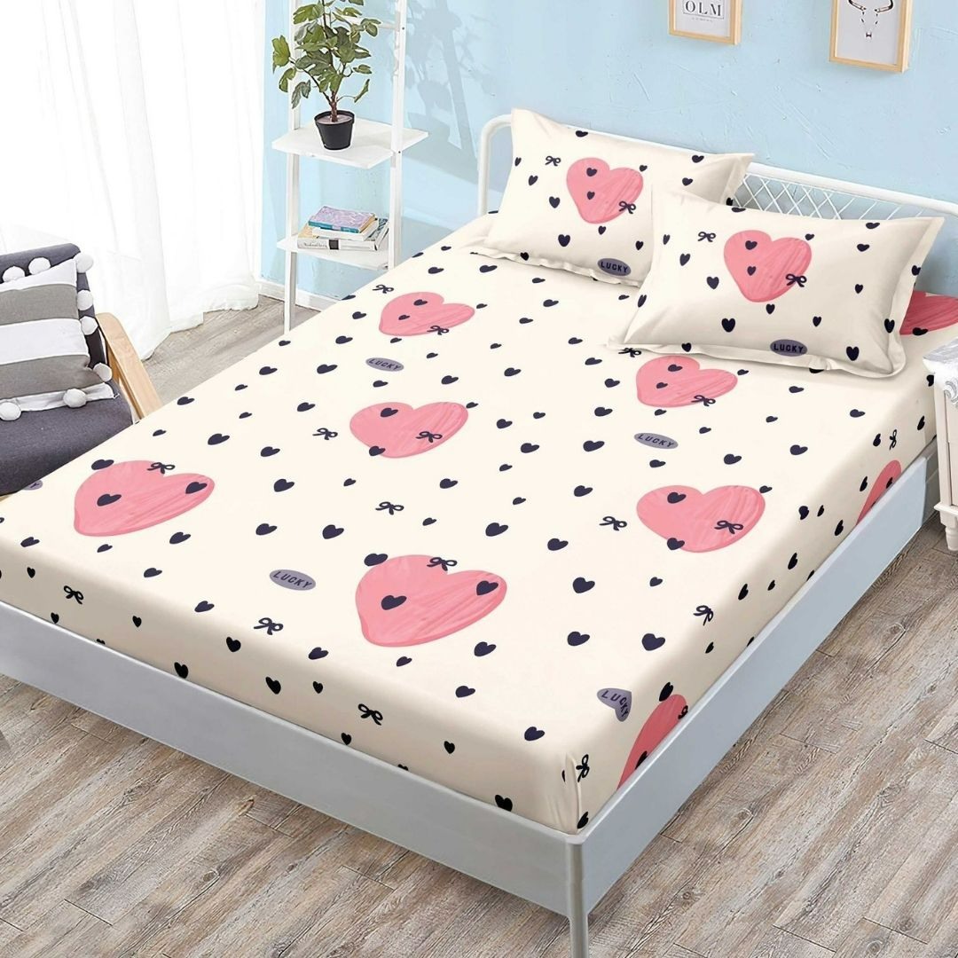 (OFERTA 3 la 159 Lei) Cearsaf cu elastic, FINET, 180x200cm, 2 fete de perne 50x70cm, Crem, Roz, Inimioare