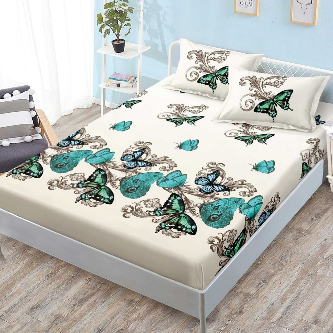 (OFERTA 3 la 159 Lei) Cearsaf cu elastic, FINET, 180x200cm, 2 fete de perne 50x70cm, Crem, Verde, Fluturi
