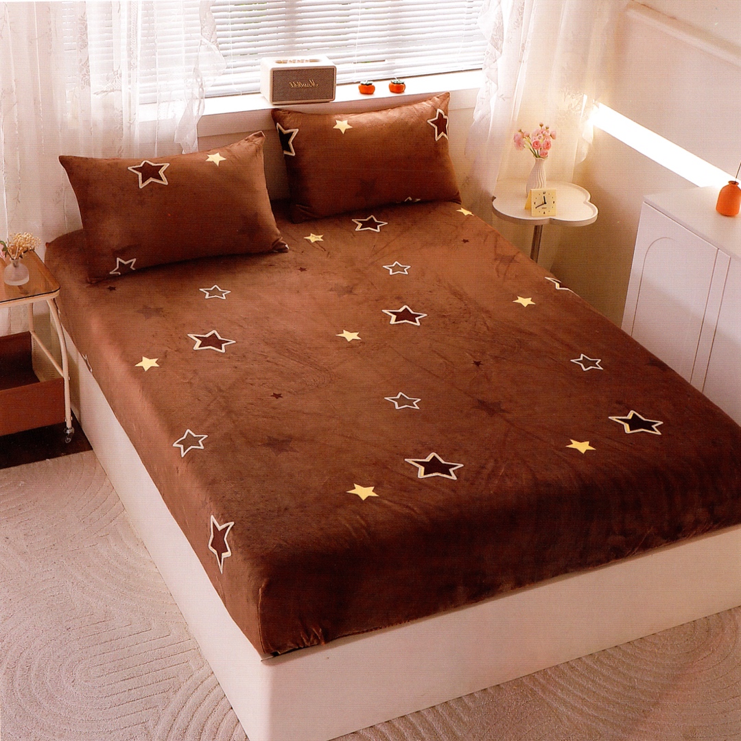 (OFERTA 3 la 199 Lei) Cearsaf cu Elastic Cocolino 180x200x25 cm – Set cu 2 Fete de Perna, Gros si Pufos, Calitate Premium pentru Confort si Eleganta, Maro, Stelute
