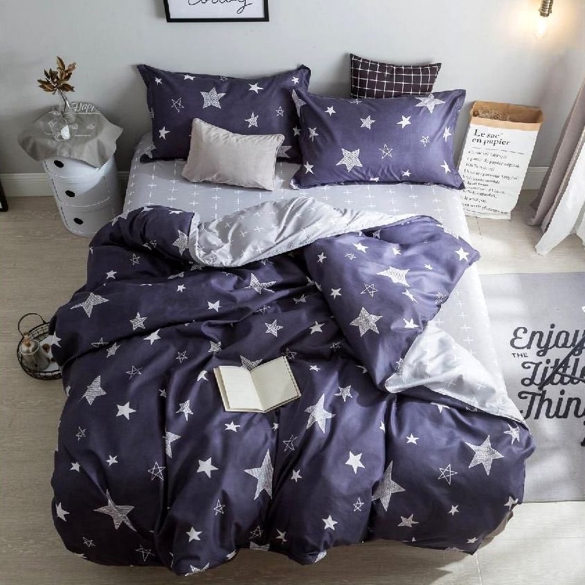 (OFERTA 3 la 199 Lei) Lenjerie pat dublu cu doua feţe, bumbac satinat, 4 piese, Bleumarin, stelute