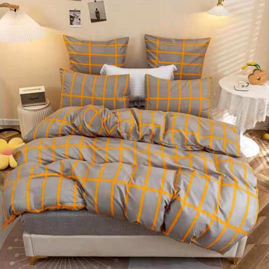 (OFERTA 3 la 199 Lei) Lenjerie pat dublu cu doua feţe, bumbac satinat, 4 piese, Gri-Mustar, carouri