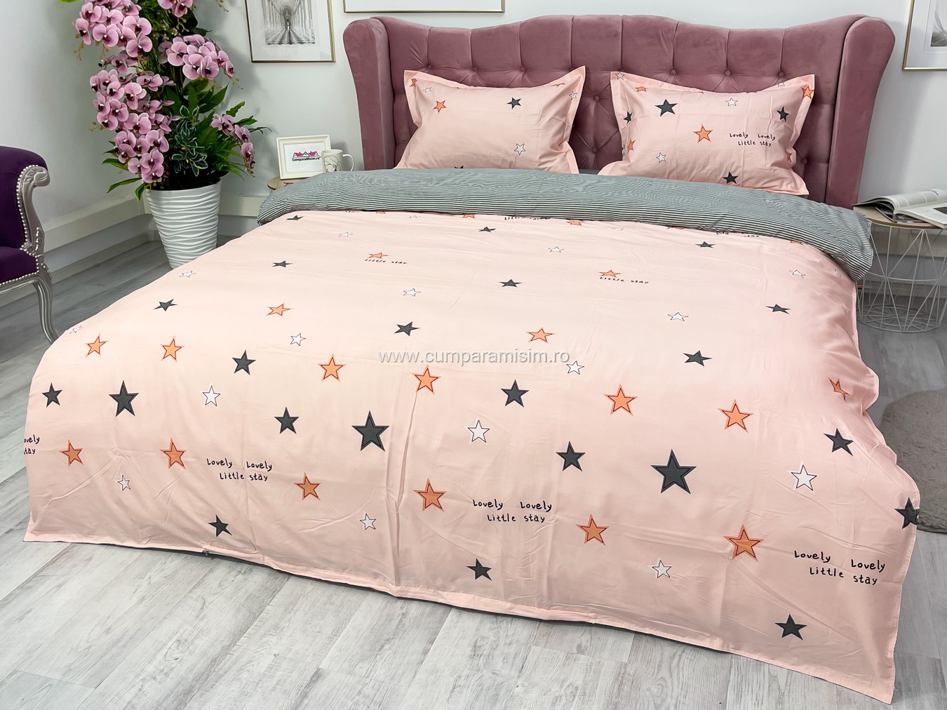 (OFERTA 3 la 199 Lei) Lenjerie pat dublu cu doua feţe, bumbac satinat, 4 piese, Roz, stelute