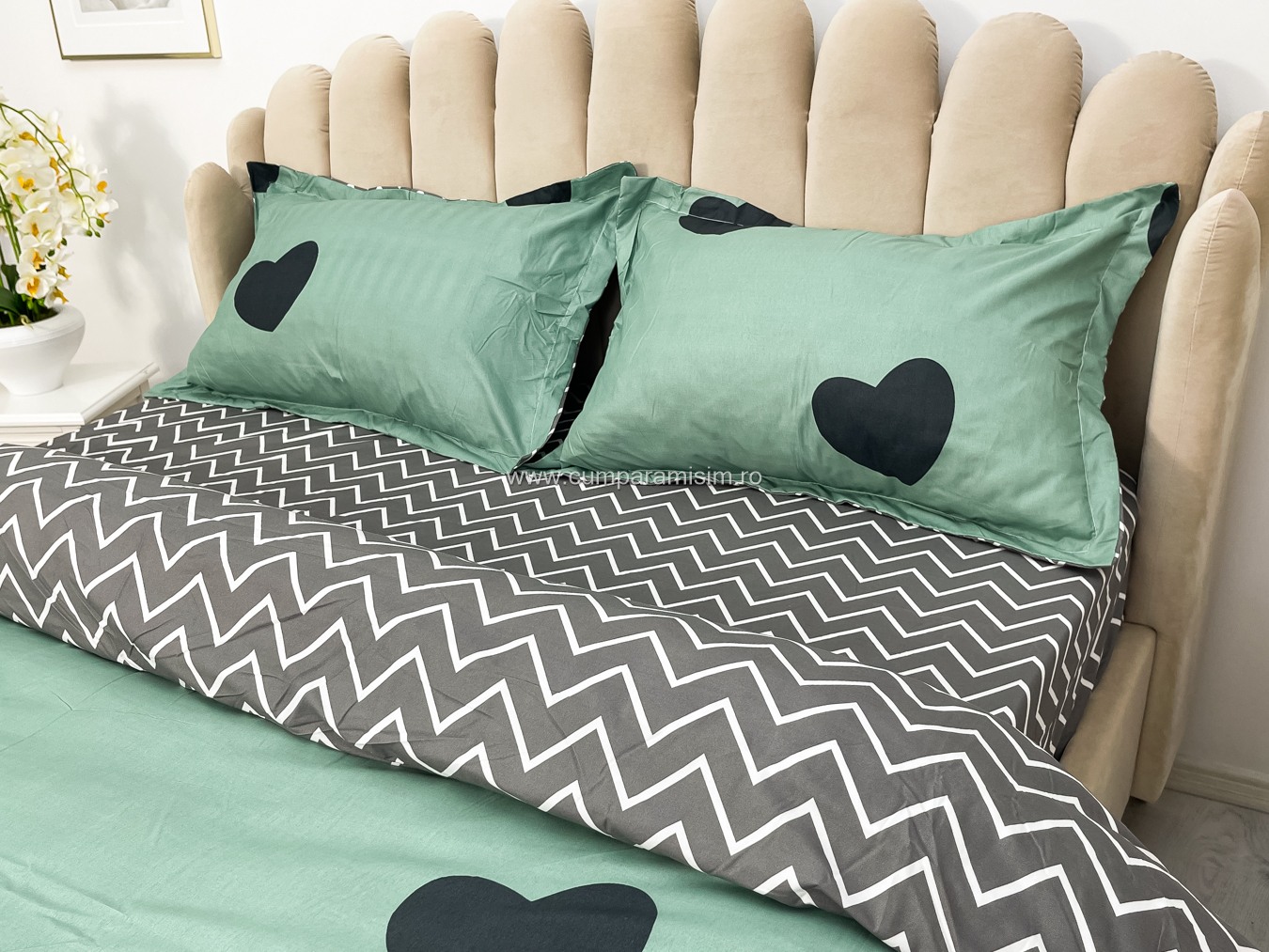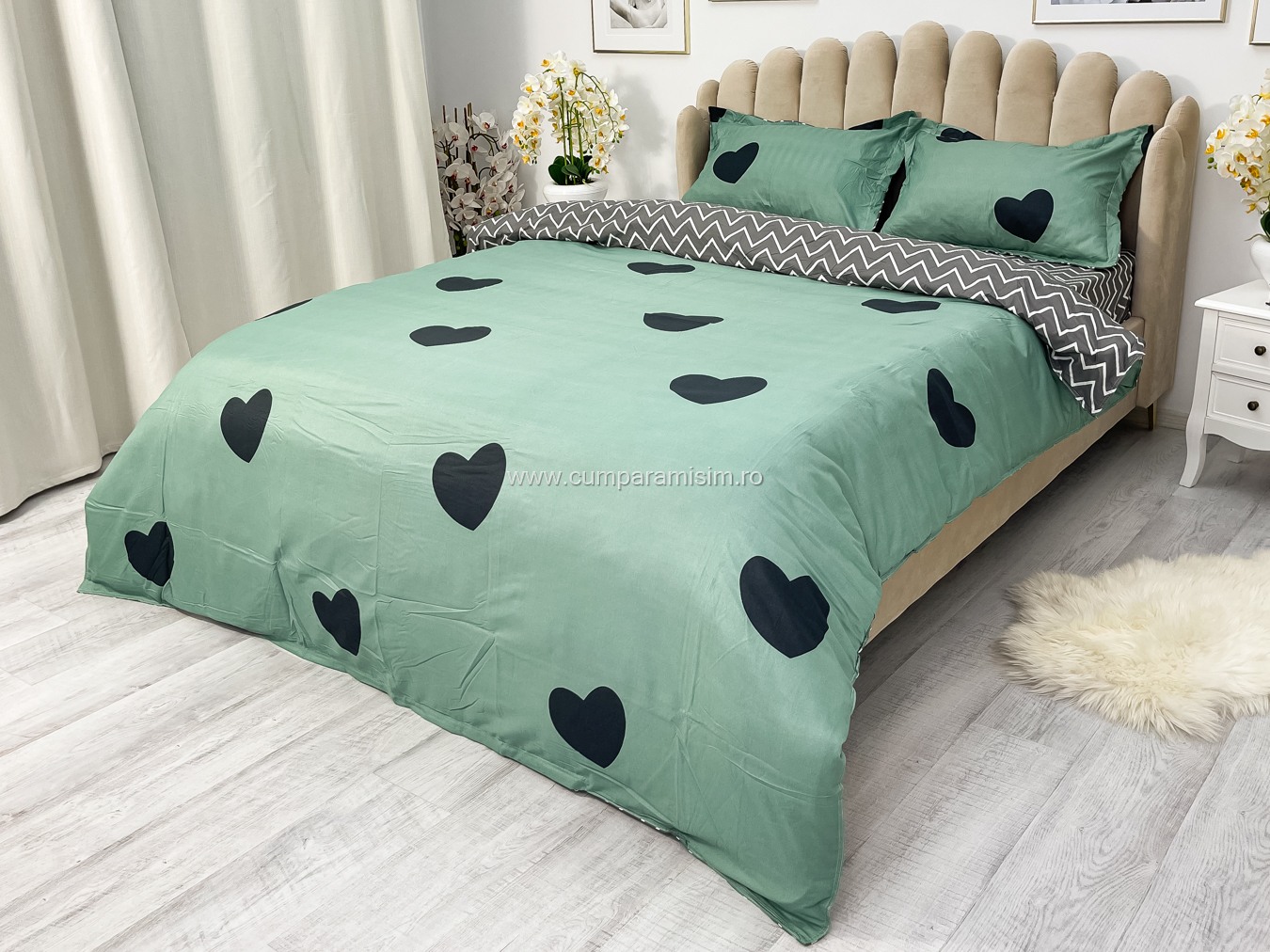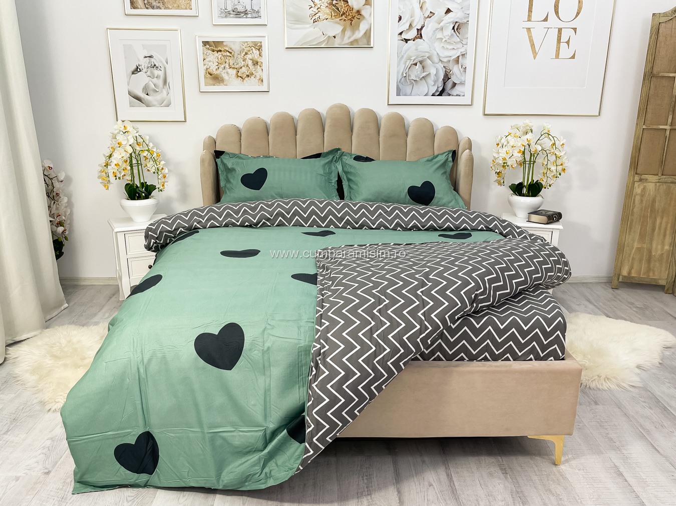(OFERTA 3 la 199 Lei) Lenjerie pat dublu cu doua feţe, bumbac satinat, 4 piese, Verde, inimioare