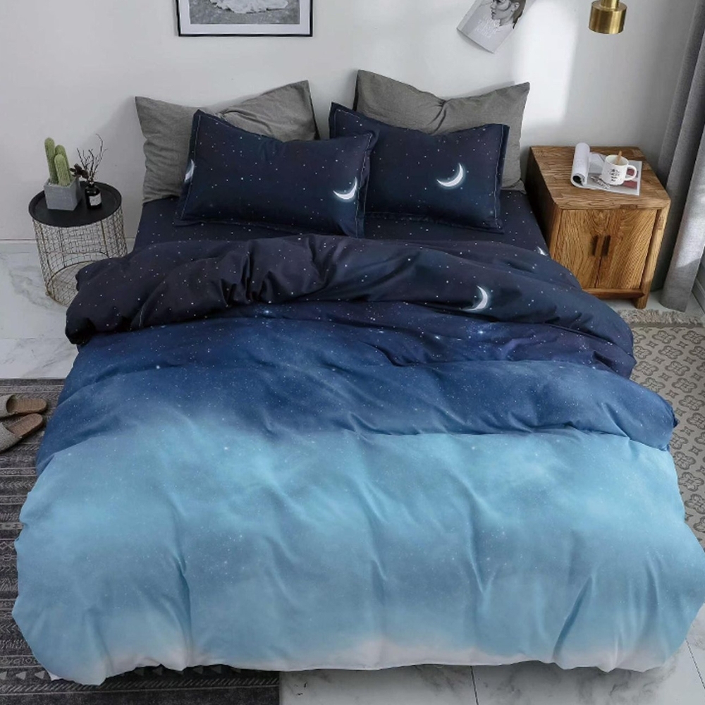 (OFERTA 3 la 219 Lei) Lenjerie pat dublu cu Elastic (160x200cm si 180x200cm), bumbac satinat, albastru, stelute