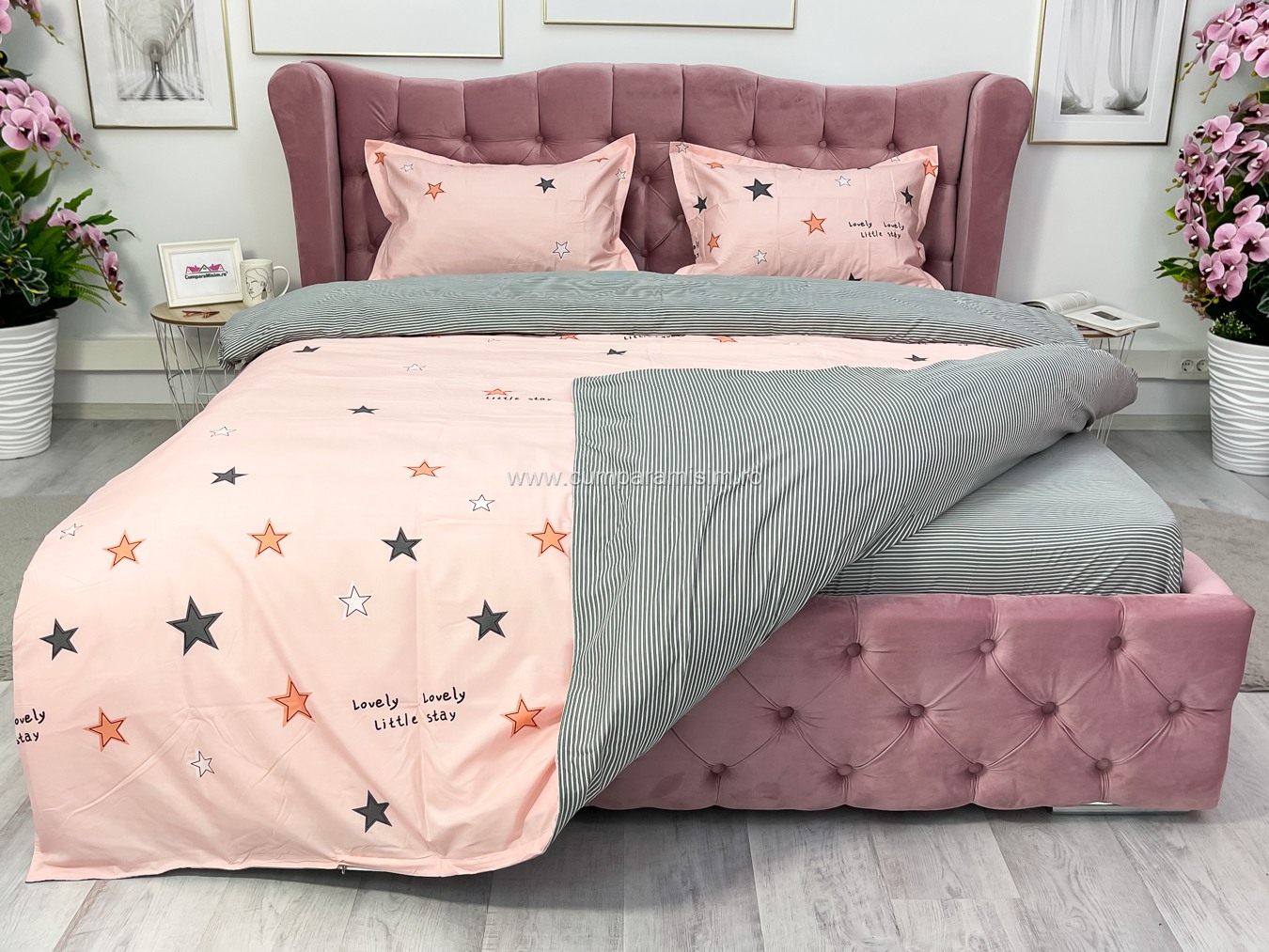 (OFERTA 3 la 219 Lei) Lenjerie pat dublu cu Elastic (160x200cm si 180x200cm), bumbac satinat, Roz, stelute