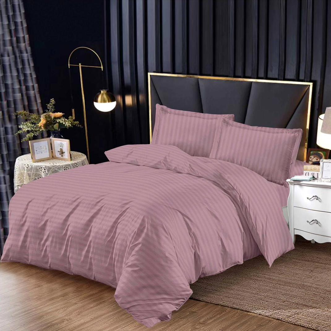 Lenjerie de pat, pentru saltea de 140x200cm, din damasc finetat, linear (tesatura din fabrica, nu imprimata, cu dunga de 1 cm grosime), confectionata din bumbac 70% + 30% poliester, cu 4 piese, folosita cel mai mult in regimul hotelier, datorita simplitatii si calitatii extraordinare. Materialul are un aspect usor lucios pentru o nota de eleganta si rafinament, datorita tesaturii speciale. Damascul este recunoscut pentru rezistenta sa in timp la nenumarate spalari, nemodificandu-si