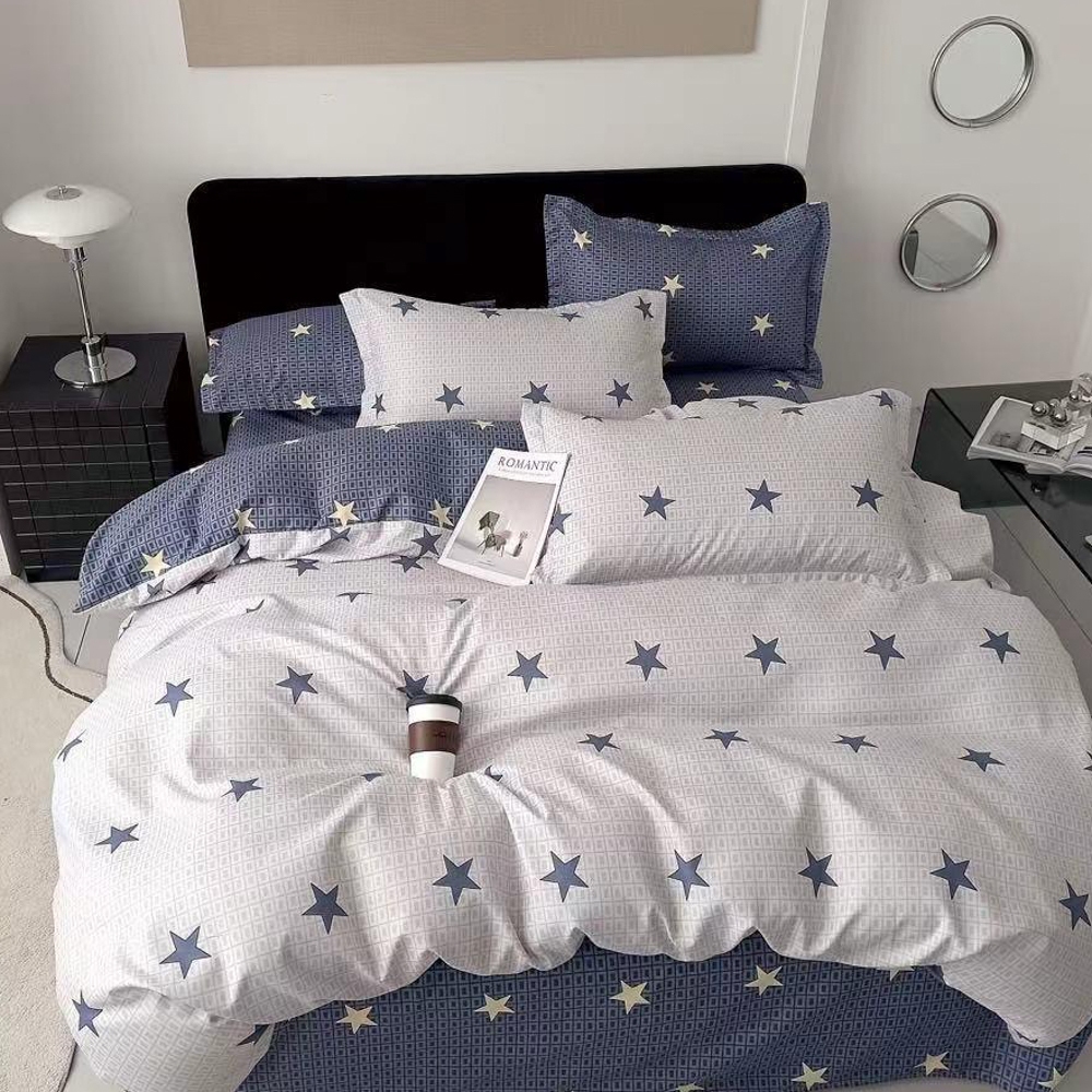 (OFERTA TRIO) Lenjerie pat dublu (140x200cm, 160x200cm, 180x200cm), FINET, 6 piese, Gri, Albastru, stelute