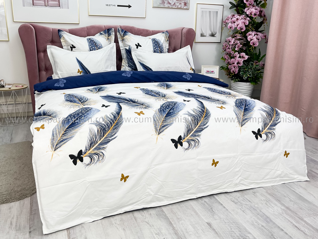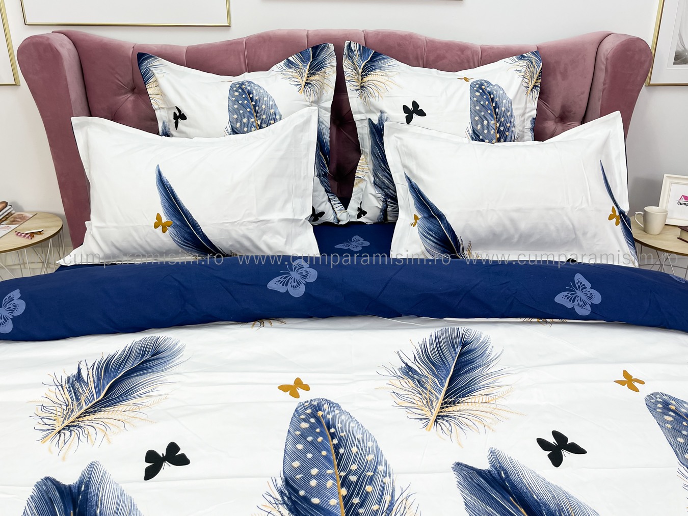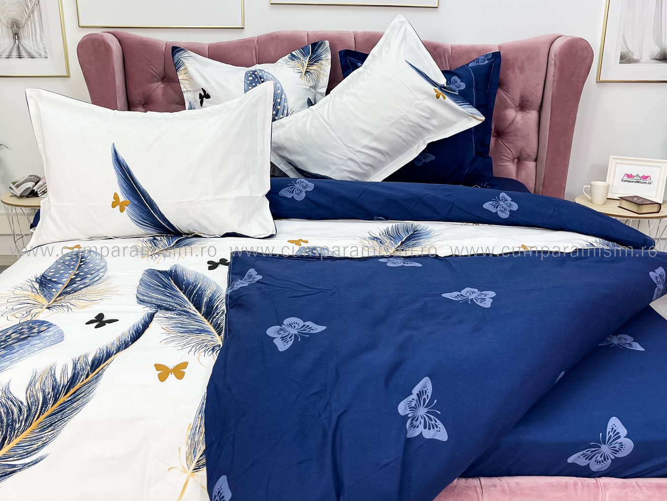 Lenjerie pat dublu, Finet, 6 piese, Albastru, pene, fluturi