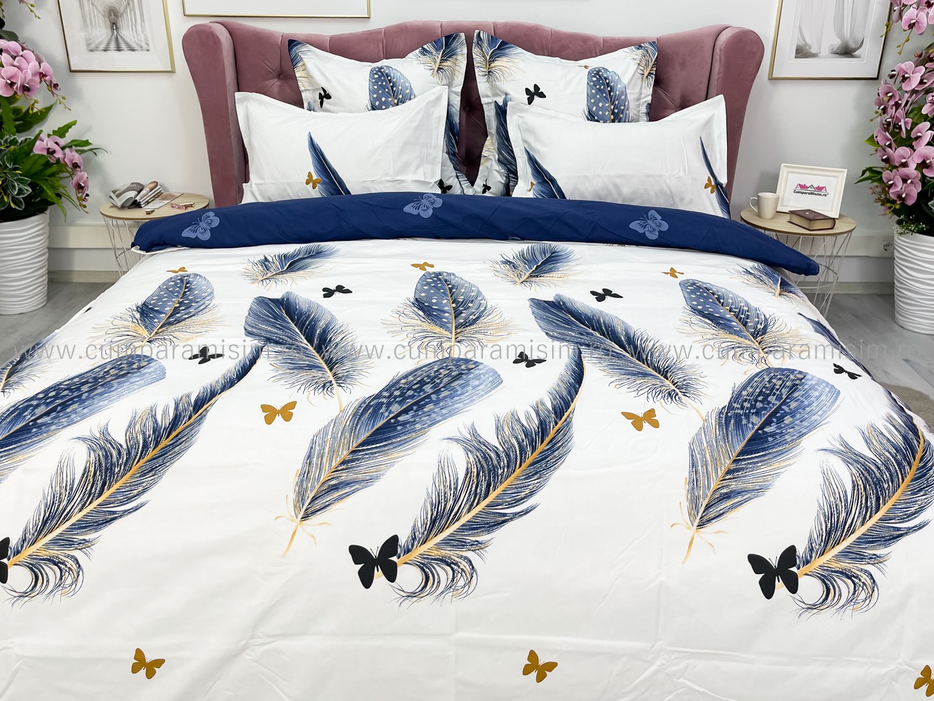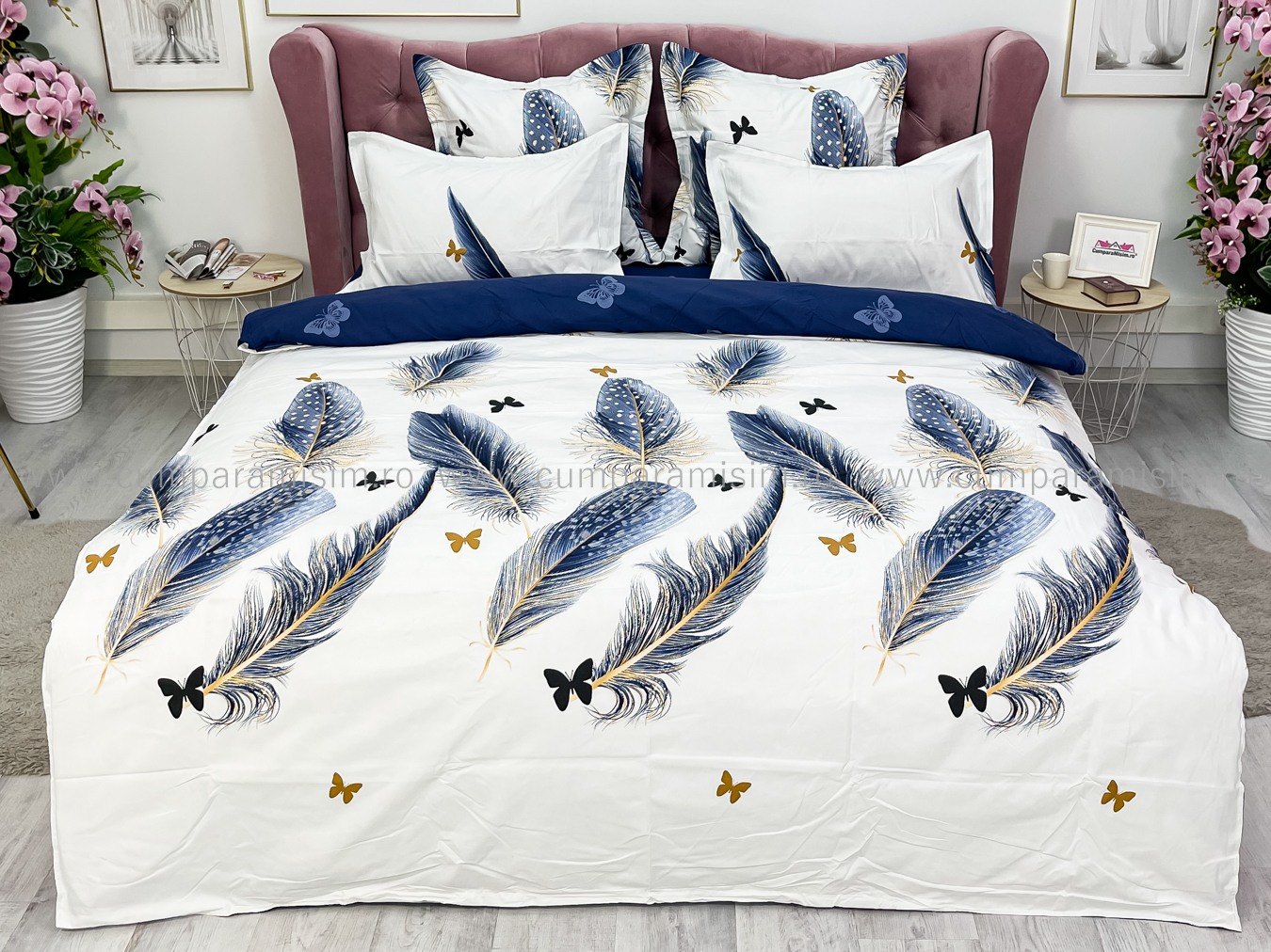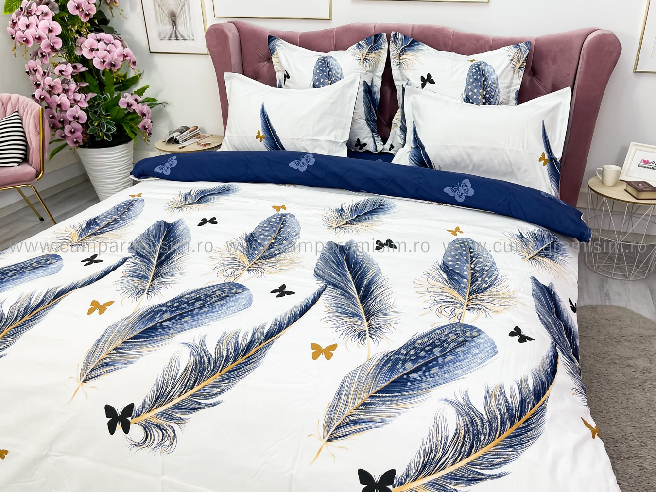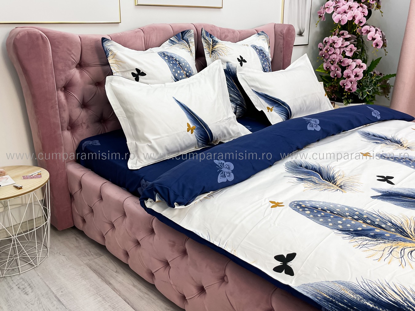 Lenjerie pat dublu, Finet, 6 piese, Albastru, pene, fluturi