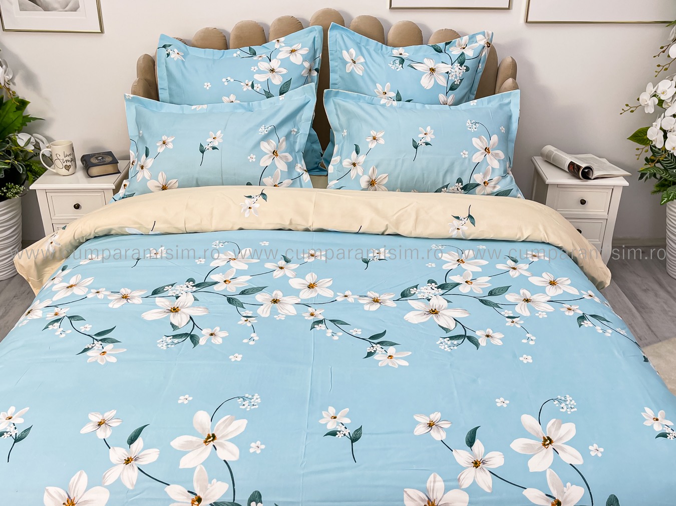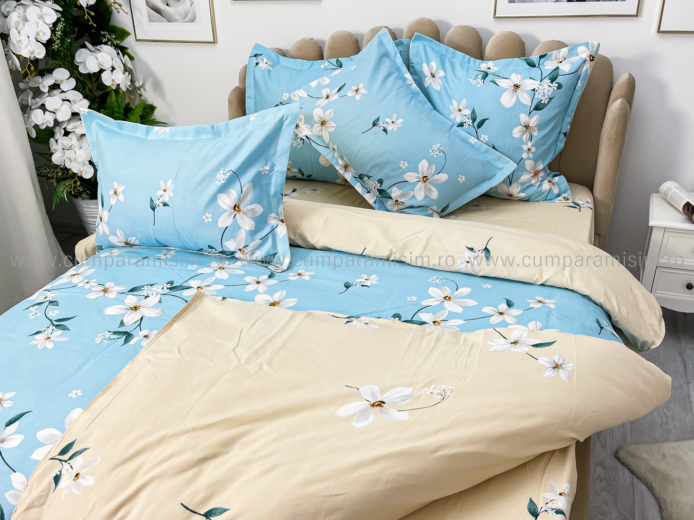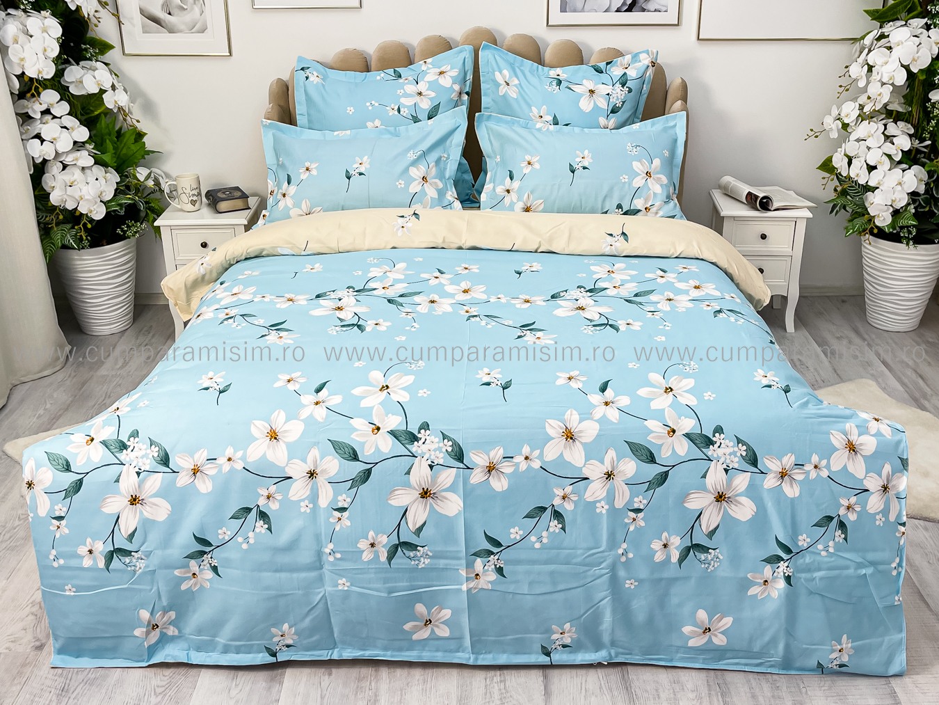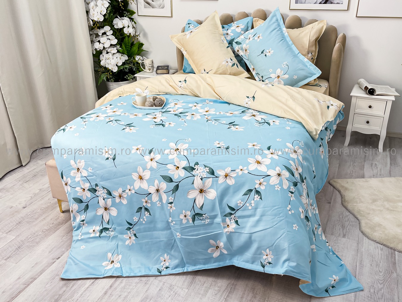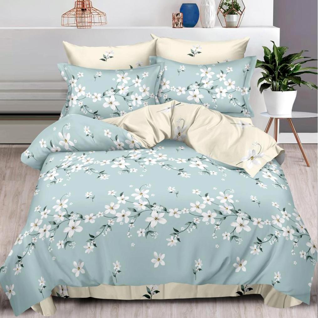 Lenjerie pat dublu, Finet, 6 piese, Bleu, flori