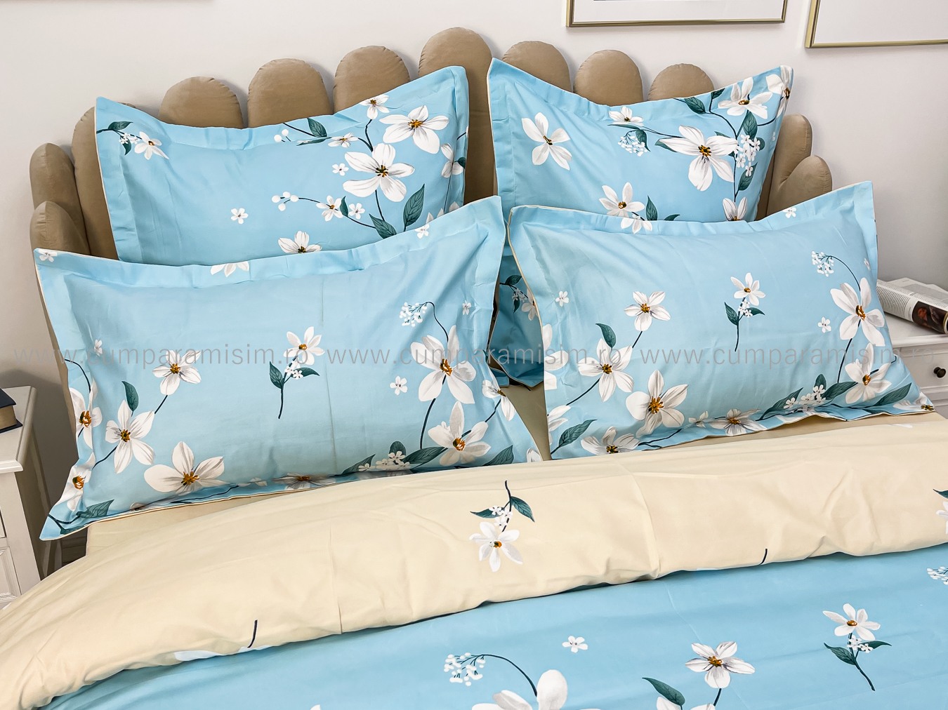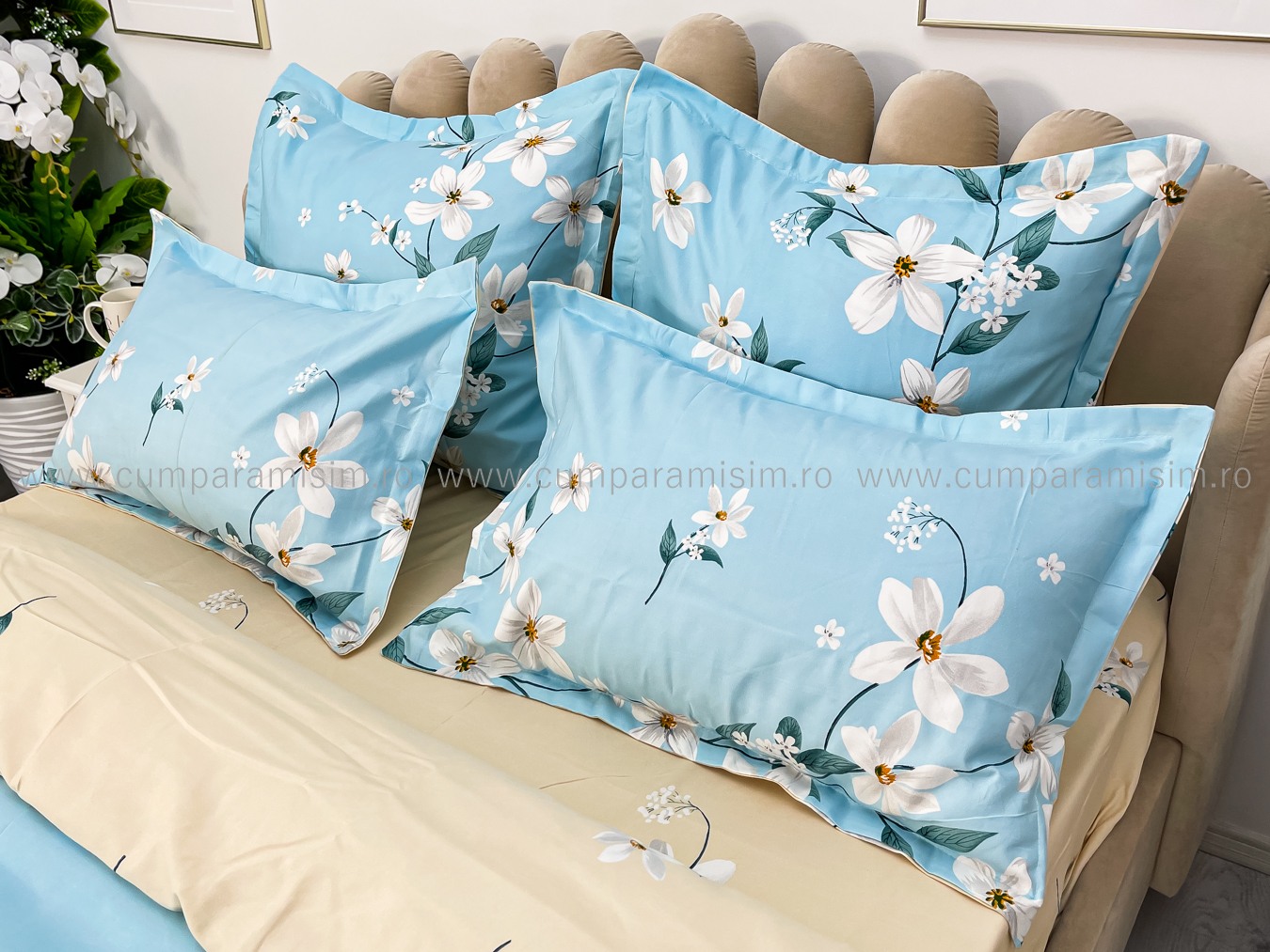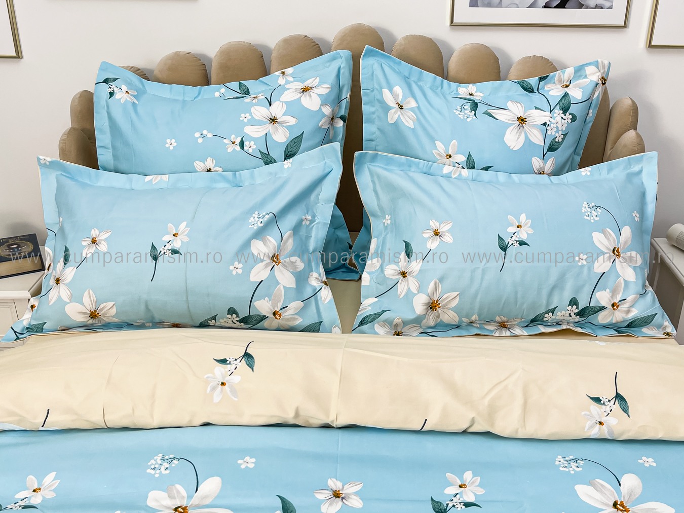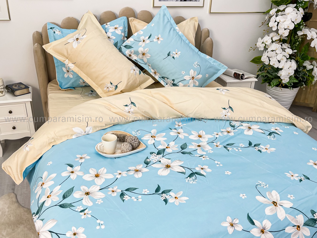 Lenjerie pat dublu, Finet, 6 piese, Bleu, flori