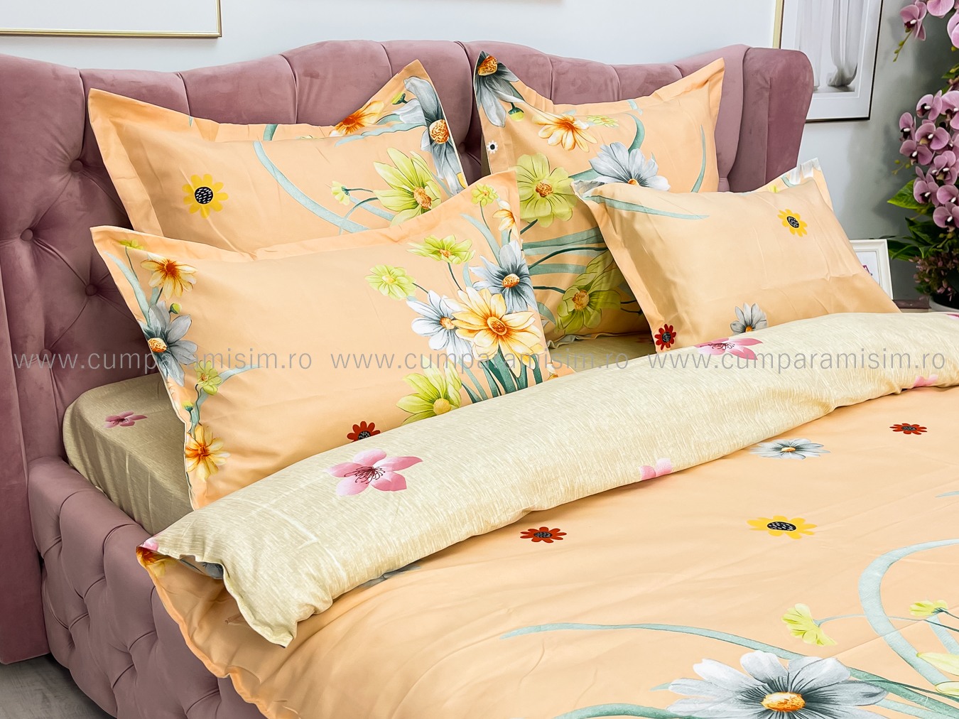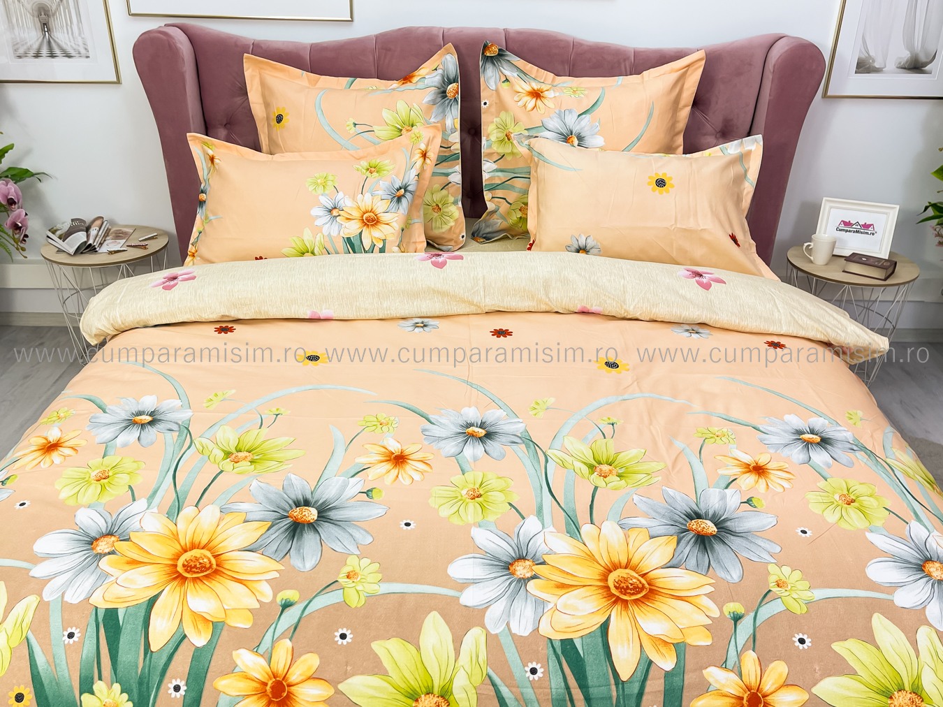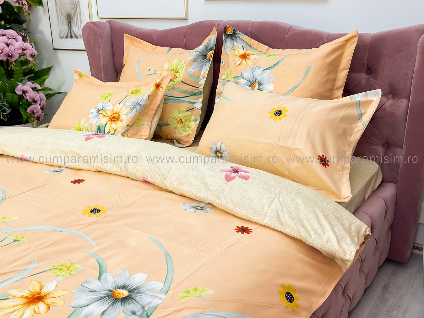 Lenjerie pat dublu cu ELASTIC, Finet, 6 piese, Bej, flori