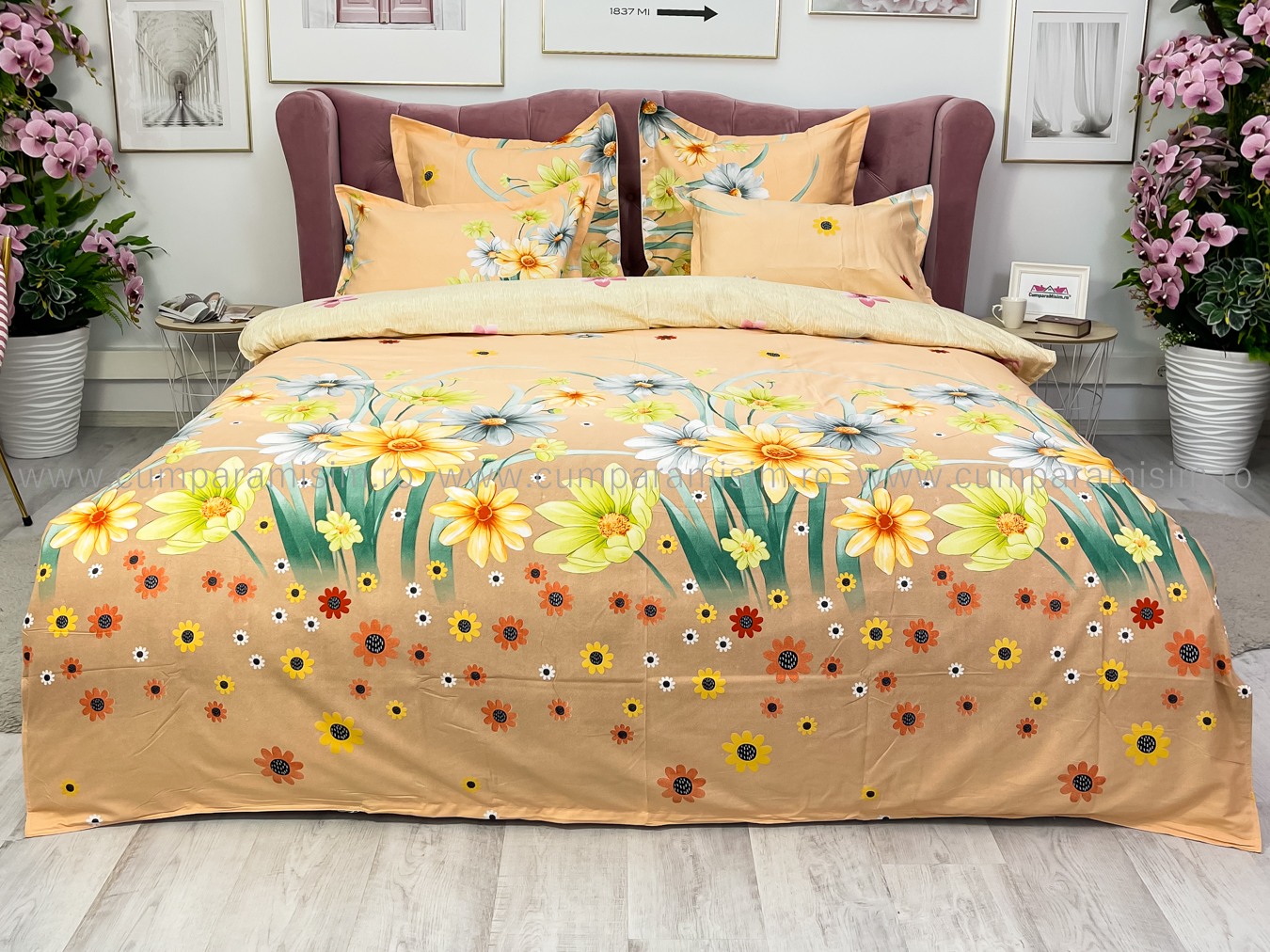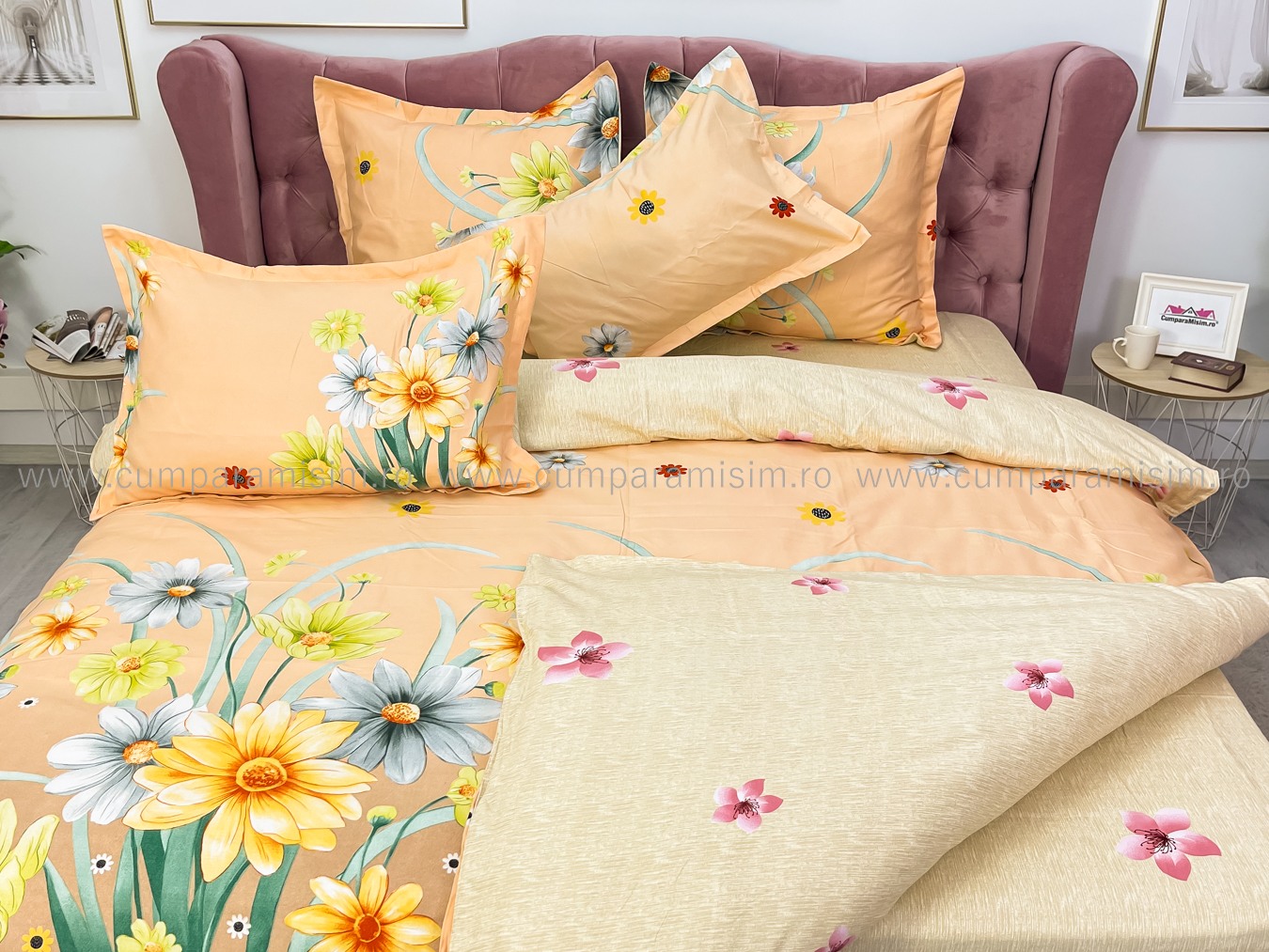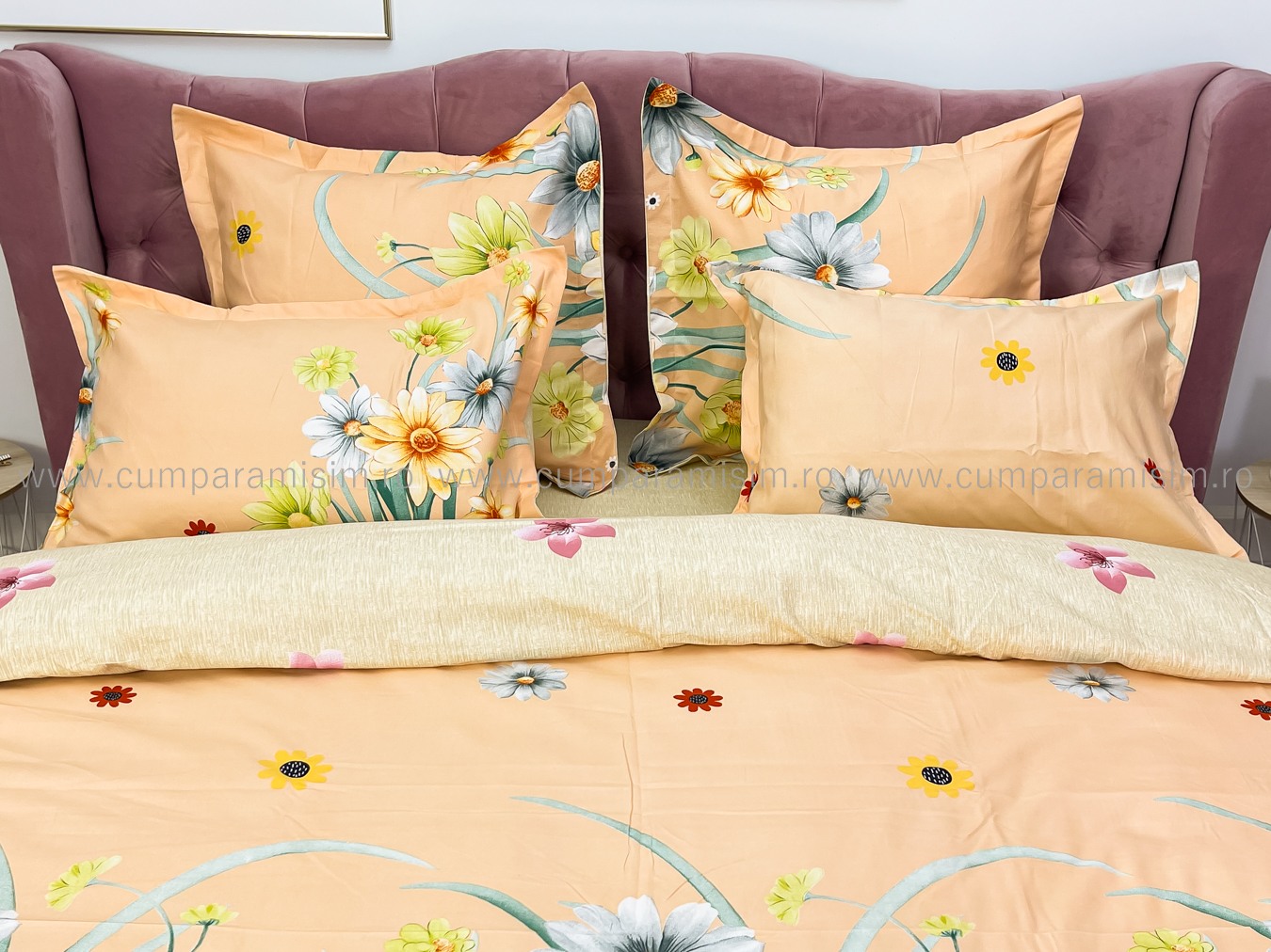 Lenjerie pat dublu cu ELASTIC, Finet, 6 piese, Bej, flori