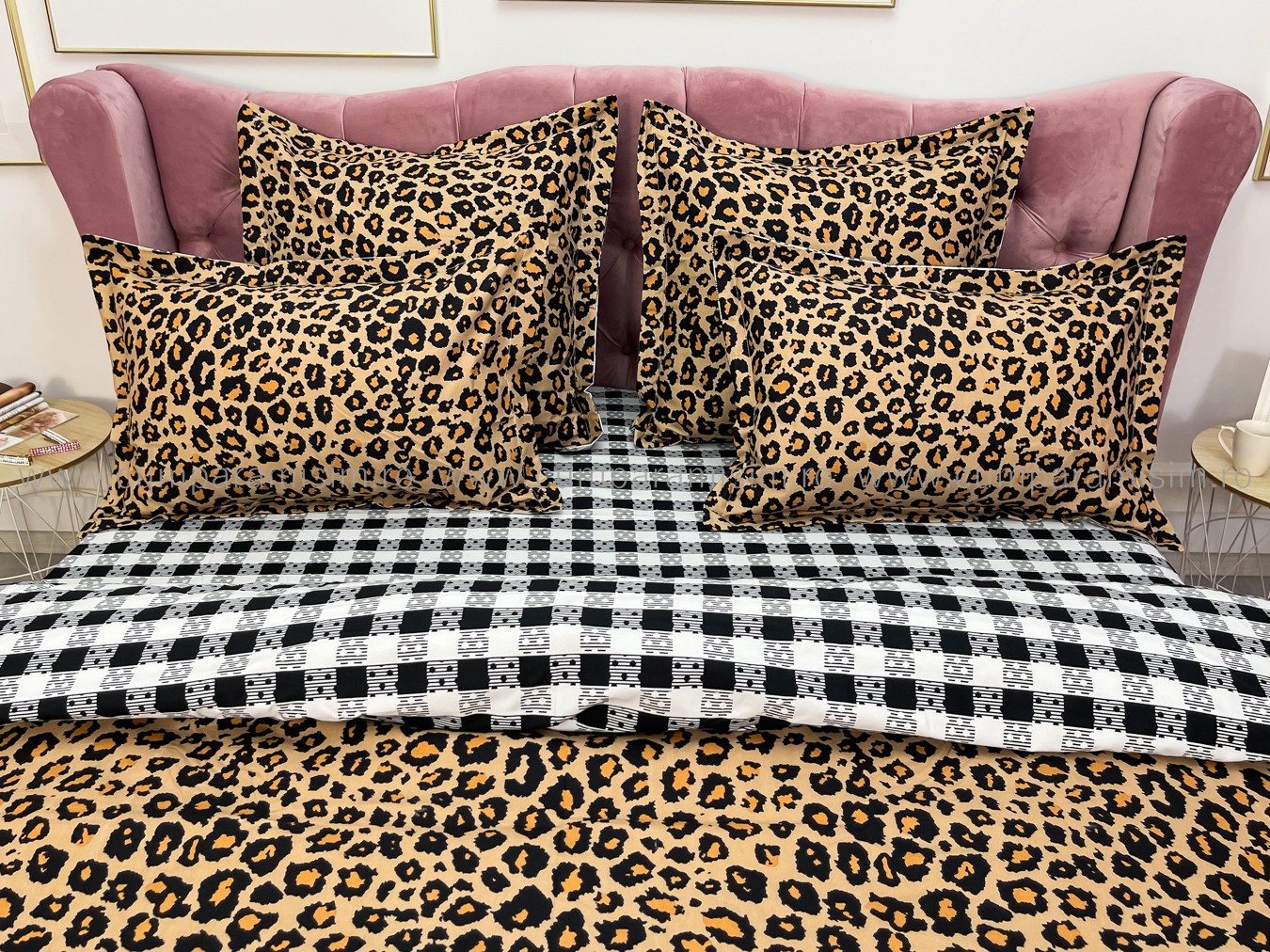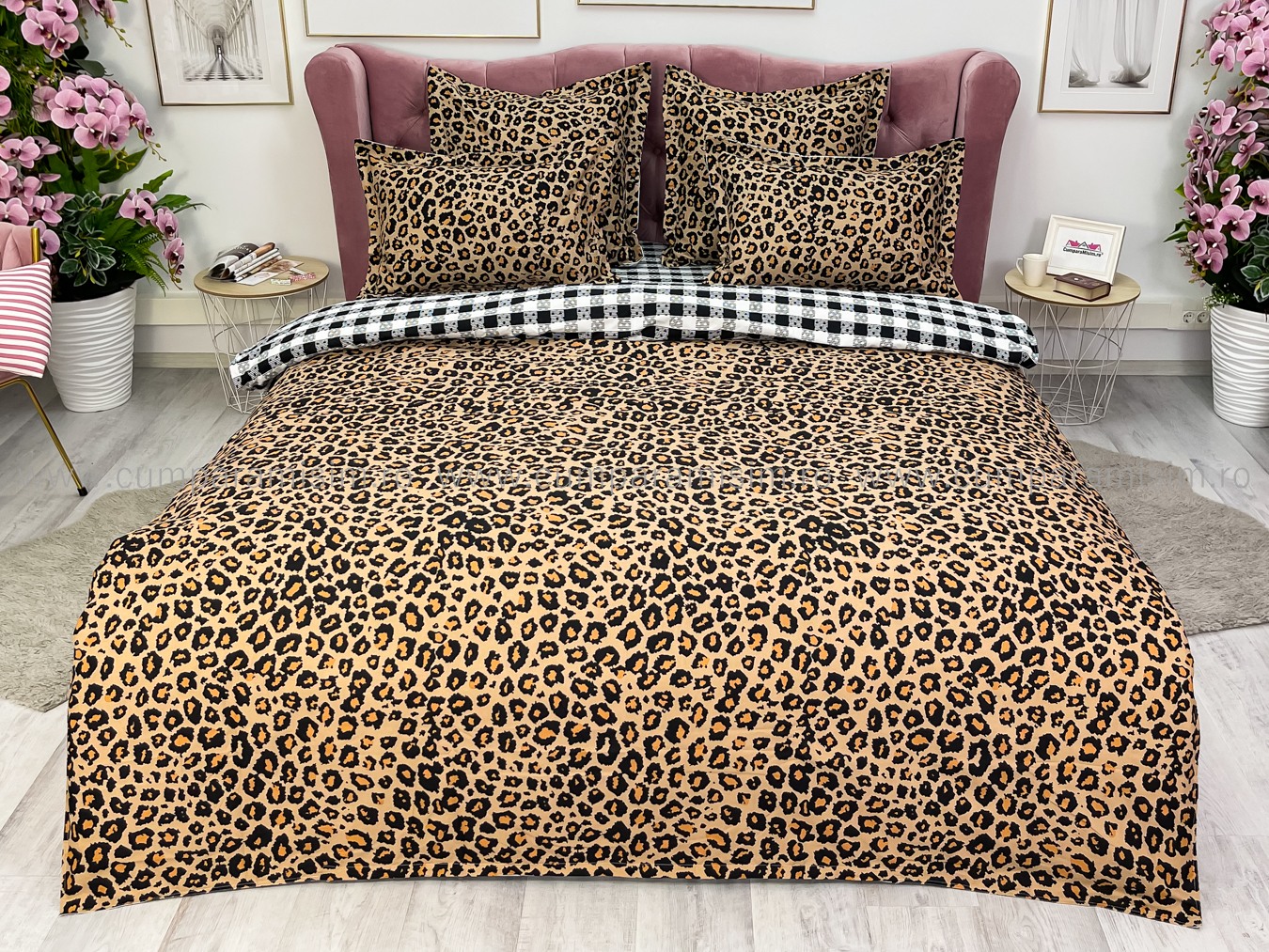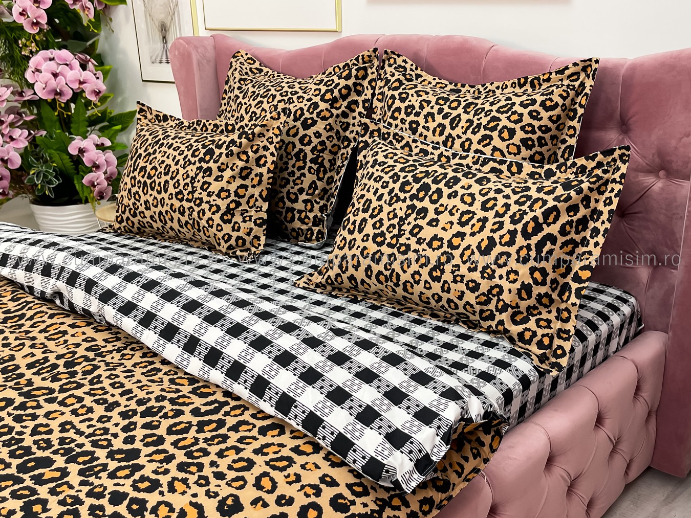 Lenjerie pat dublu cu ELASTIC, Finet, 6 piese, Maro, animal print