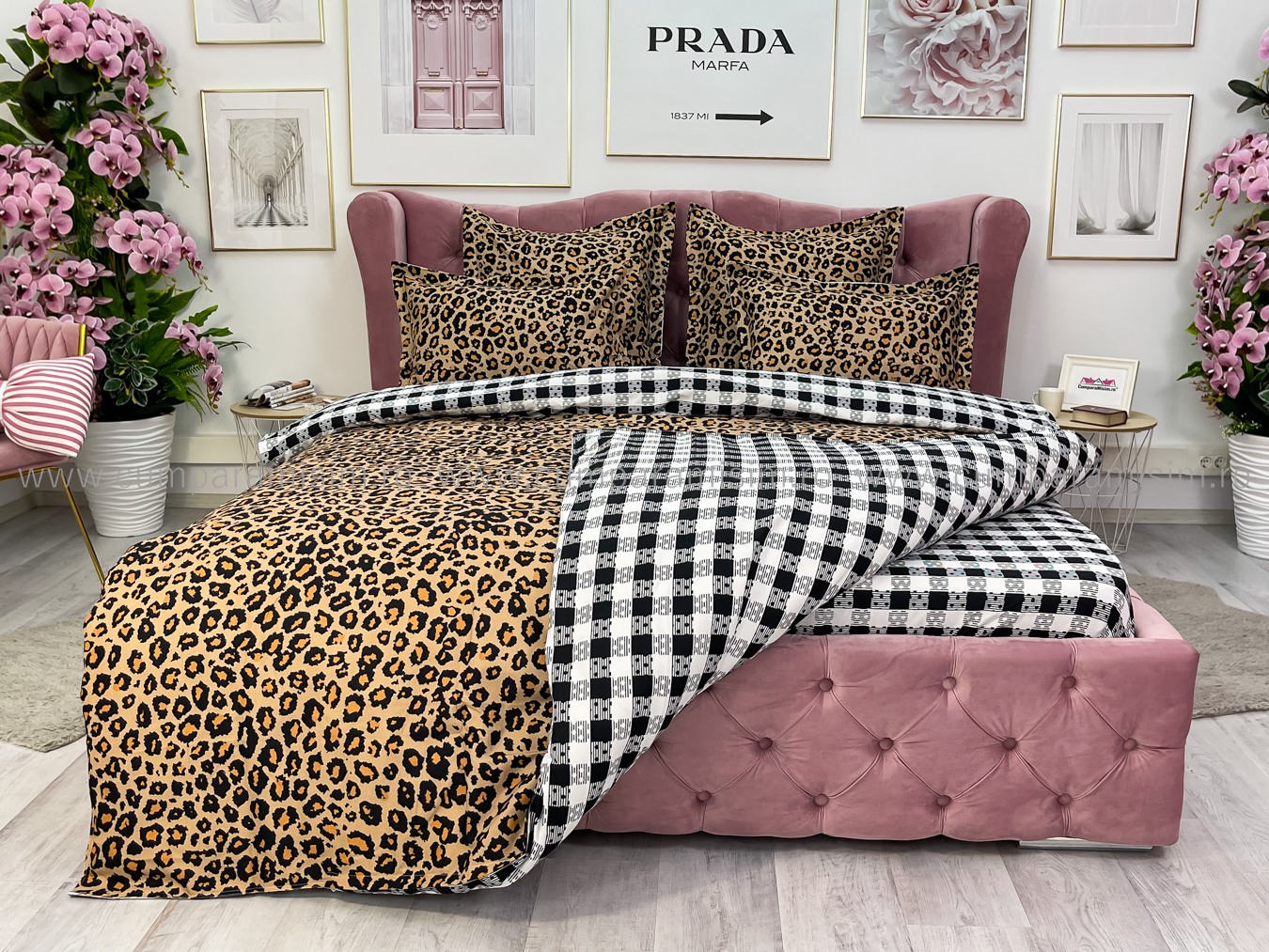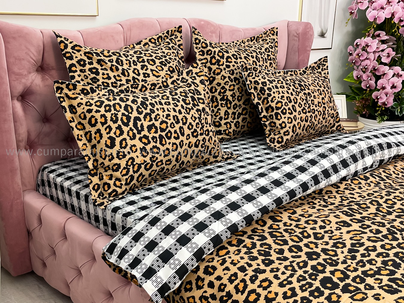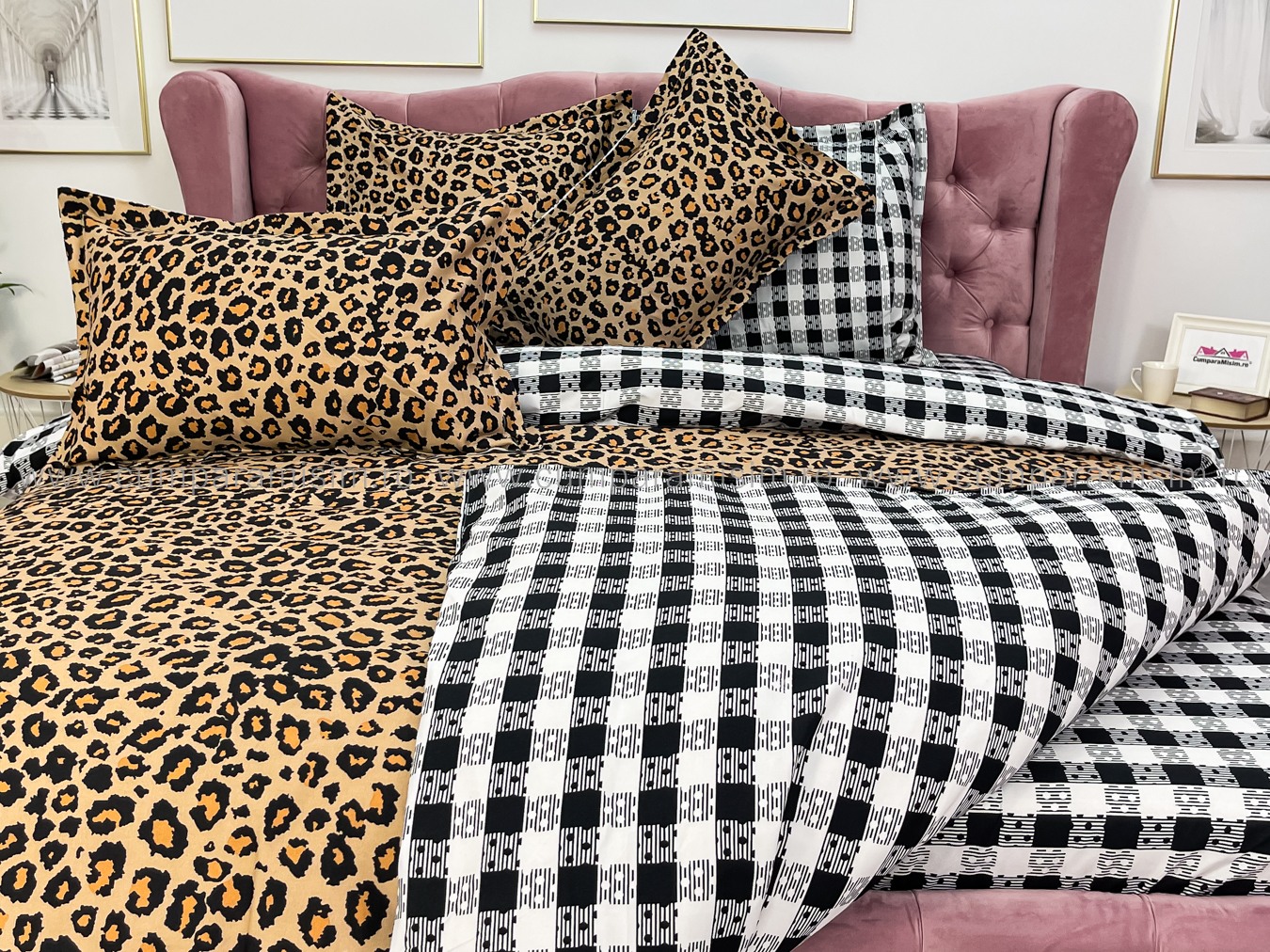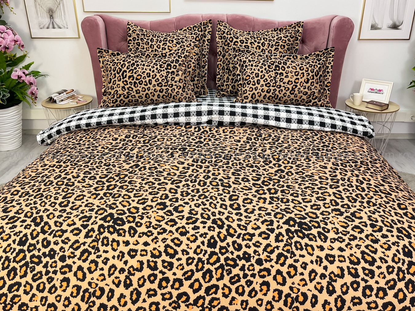 Lenjerie pat dublu cu ELASTIC, Finet, 6 piese, Maro, animal print
