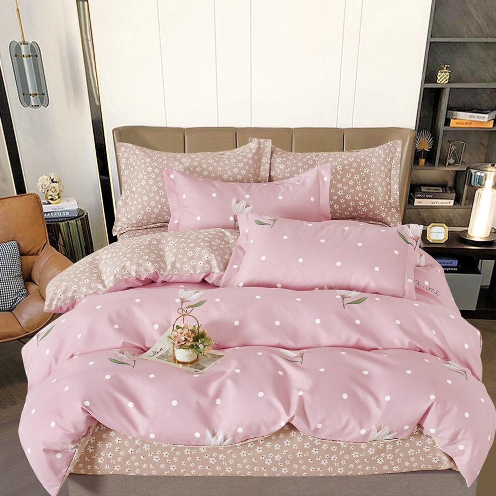 Lenjerie pat dublu cu ELASTIC, Finet, 6 piese, Roz, magnolii, buline