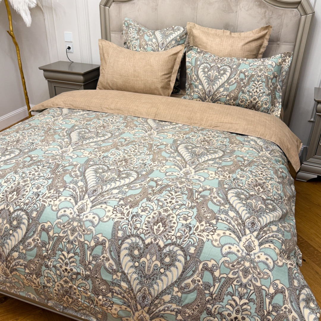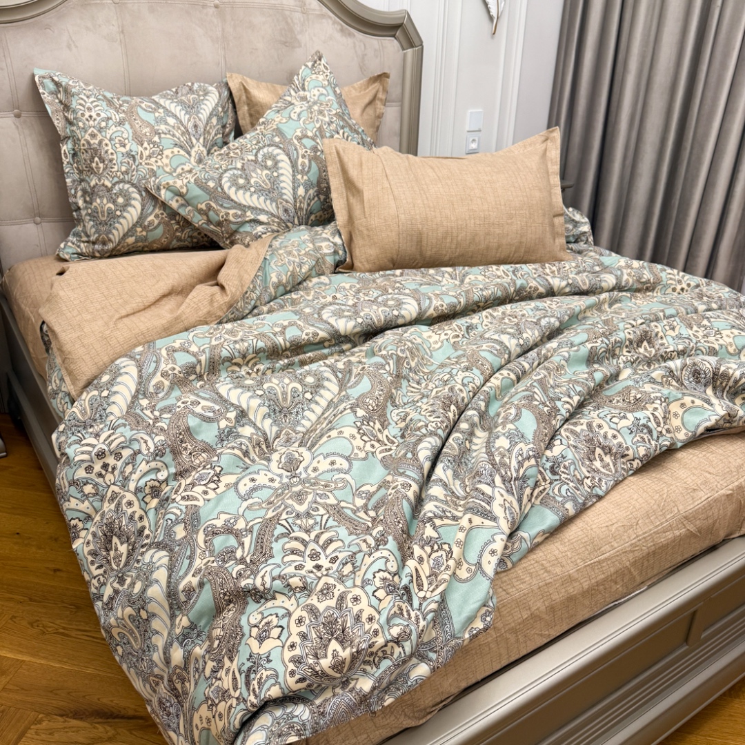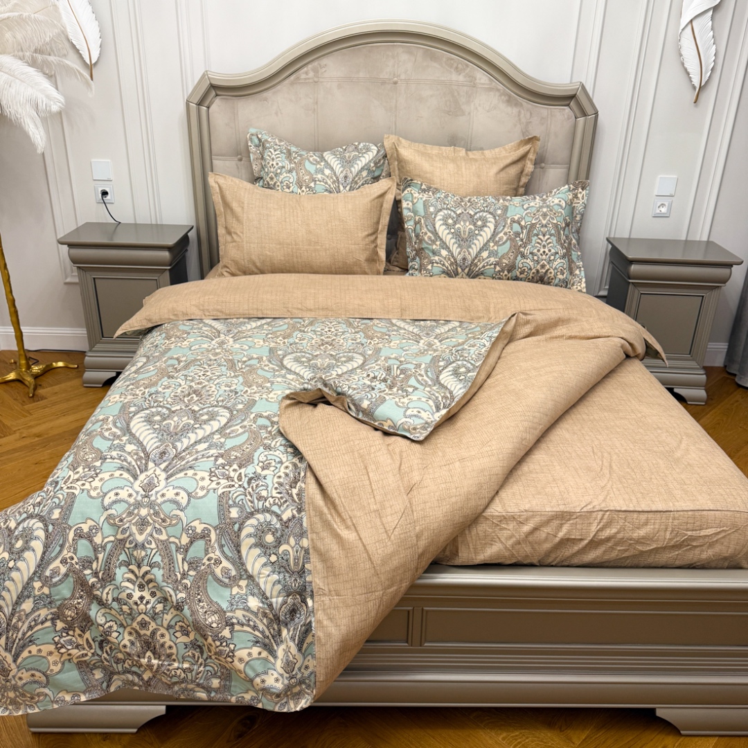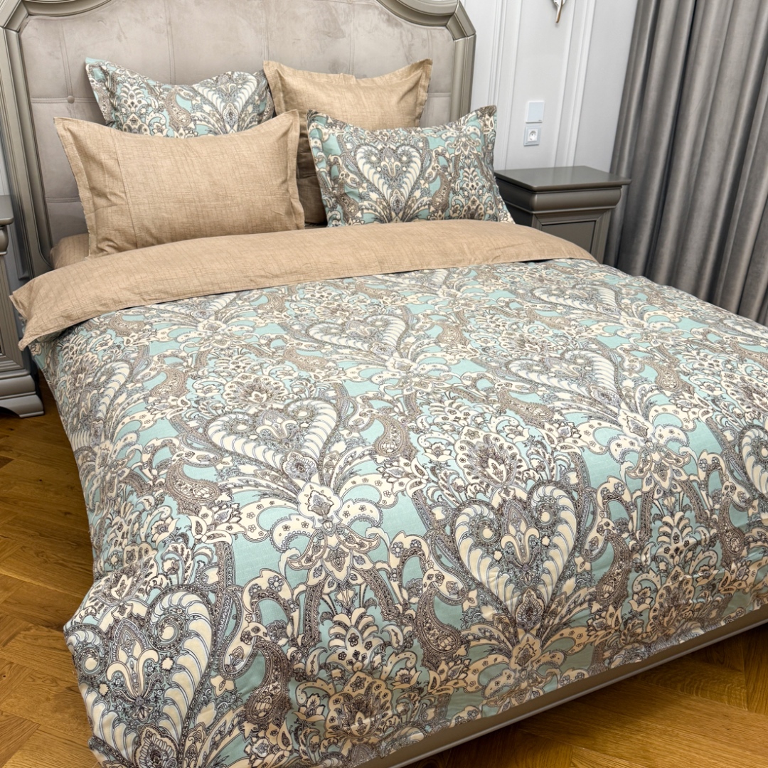 (OFERTA TRIO) Lenjerie pat dublu, FINET, cu elastic, 6 piese, Bleu, Bej, Model Royal