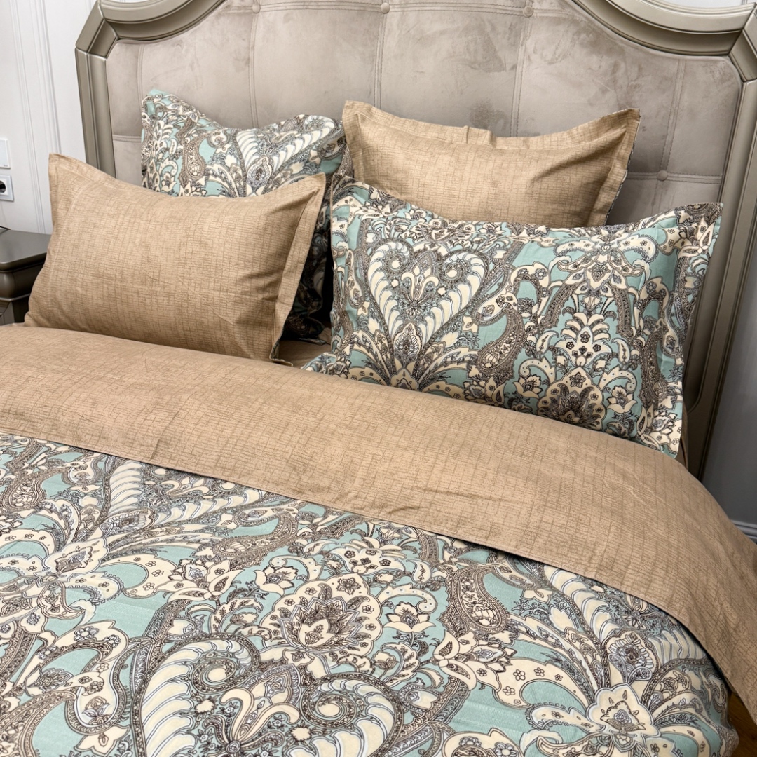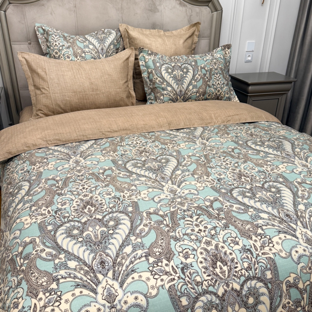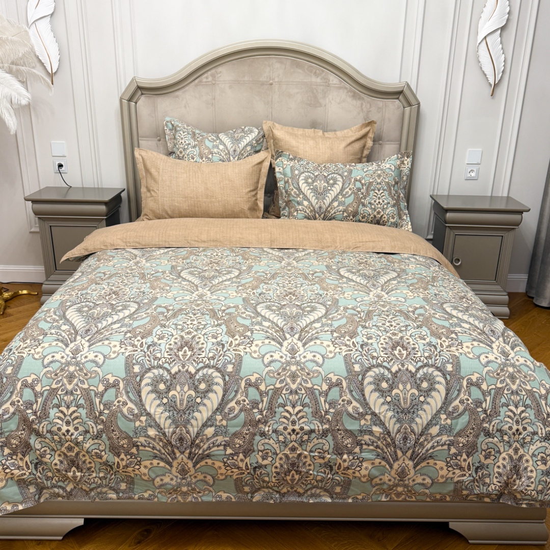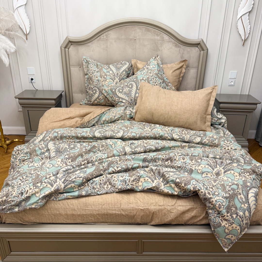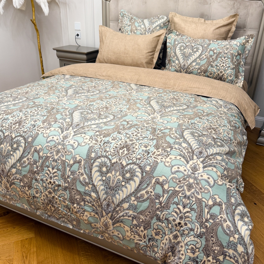 (OFERTA TRIO) Lenjerie pat dublu, FINET, cu elastic, 6 piese, Bleu, Bej, Model Royal