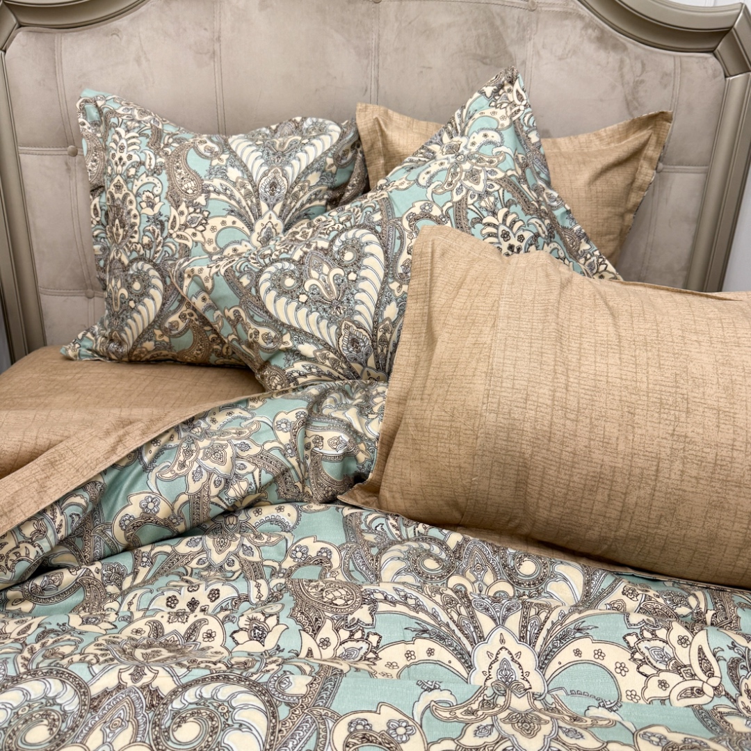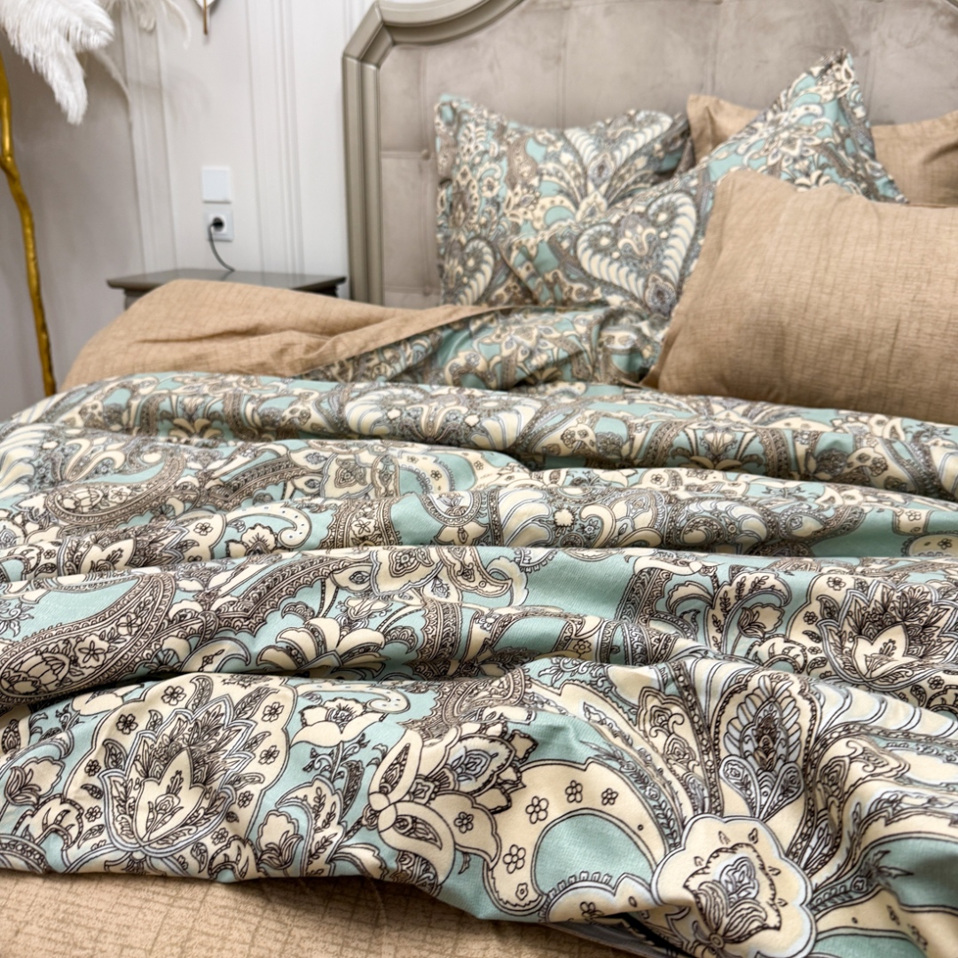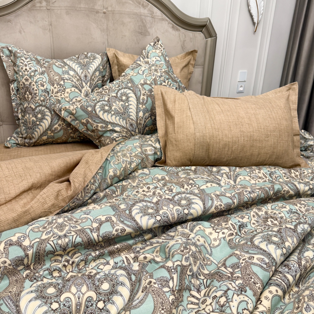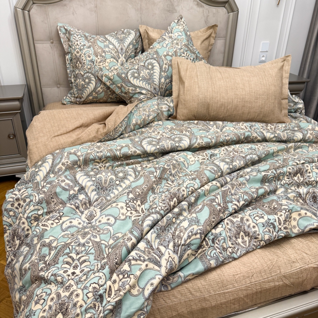 (OFERTA TRIO) Lenjerie pat dublu, FINET, cu elastic, 6 piese, Bleu, Bej, Model Royal