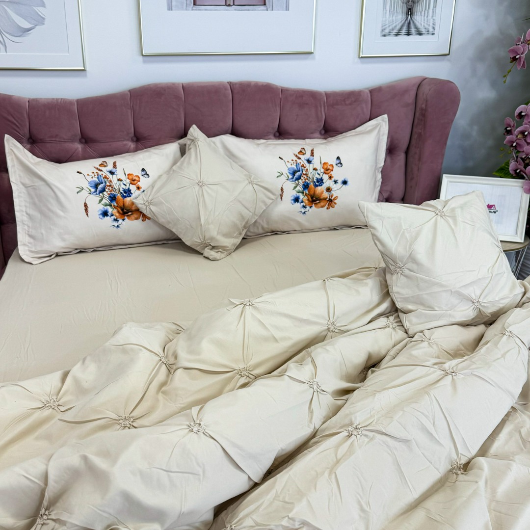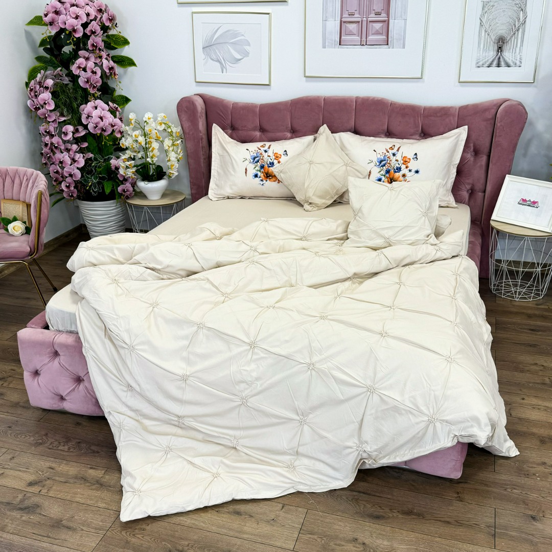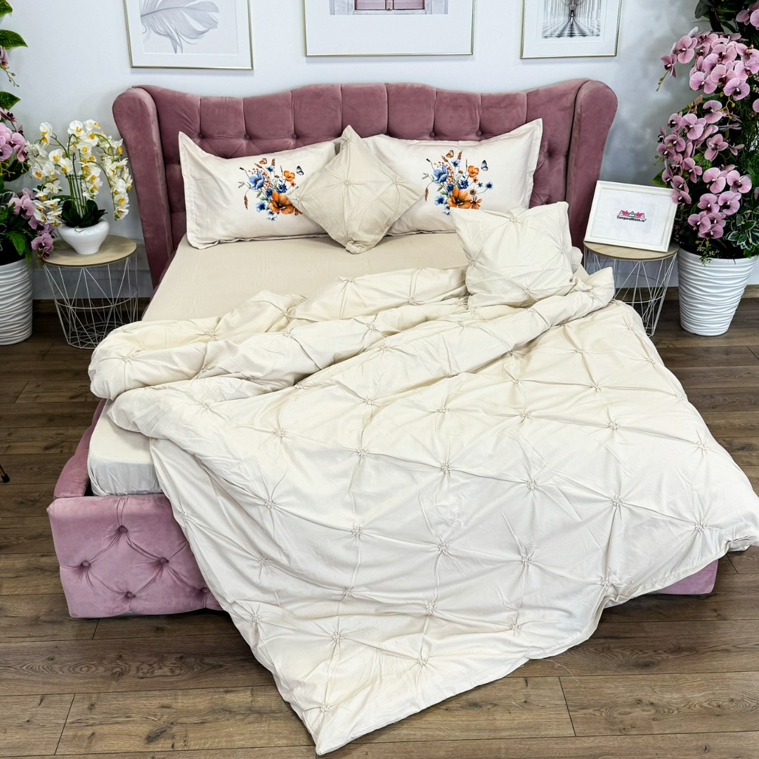 Acest set de lenjerie de pat dublu, Finet Satinat Deluxe cu Pliuri Brodate, identic cu poza, este adevaratul exemplu de eleganta si confort. Fabricat din finet satinat de inalta calitate, acest set de lenjerie de pat ofera o senzatie de matase, garantand un somn linistit si placut. Designul cu pliuri brodate adauga un plus de rafinament, conferind o nota de lux si stil camerei dvs. Fiecare detaliu este atent conceput, astfel incat setul sa fie nu doar frumos, ci si durabil. Acest mater
