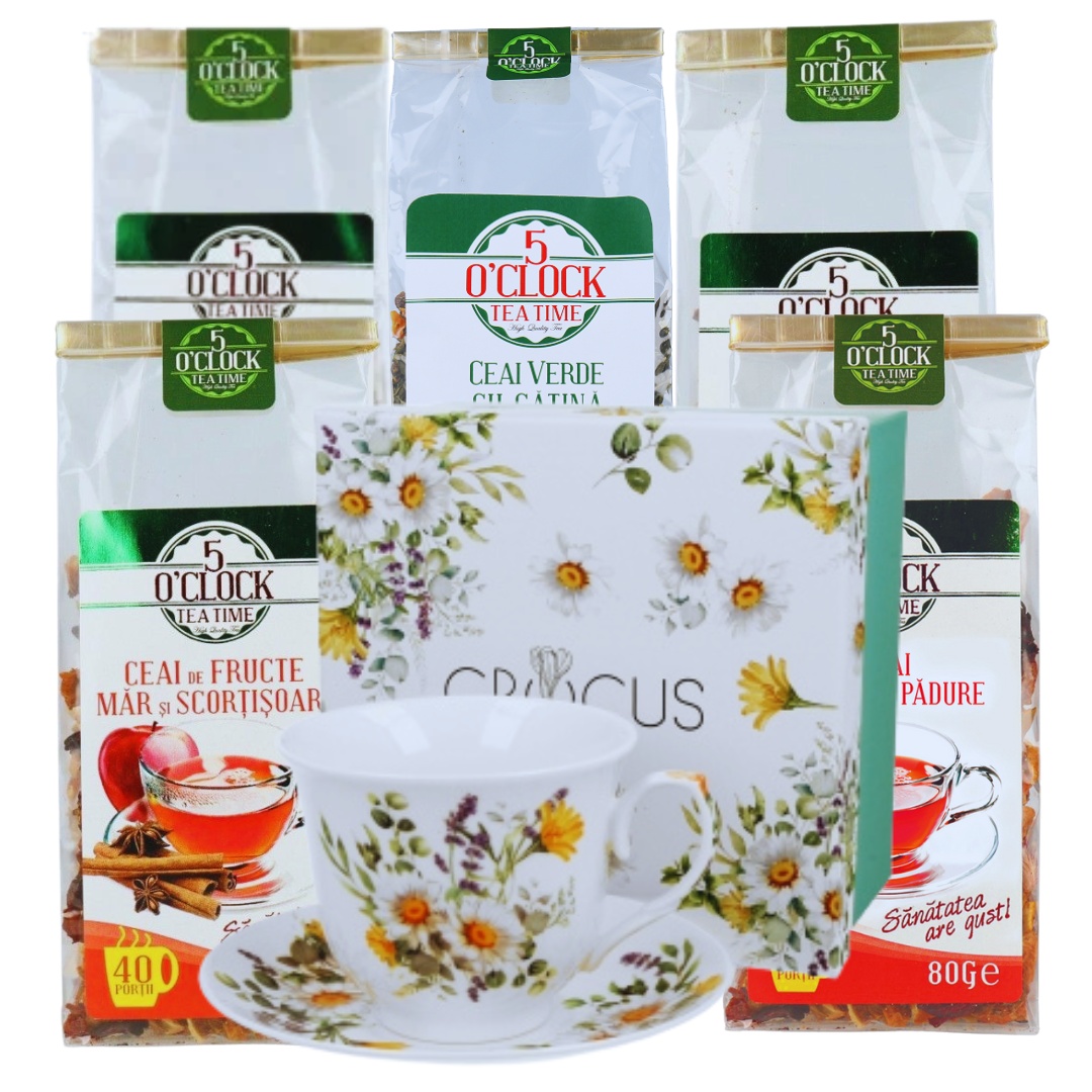 5 OClock Tea Ceai de fructe cu Mar si Trandafir este unul dintre cele mai aromate ceaiuri naturale. Are un gust dulceag, asa ca nu e nevoie sa-i adaugi zahar. Si miroase senzational! Este un ceai care poate fi savurat si de catre cei mari, si de catre cei mici. Se poate servi atat rece, cat si fierbinte. Este sortimentul ideal in dupa-amiezele tale relaxante. Ingrediente: Mar (min. 29%), stafide, pere (min. 17%), hibiscus, sfecla rosie, arome, boboci de trandafir, capsuni (min. 1.4%), frunze de bambus. Produs in UE Merge cu: tarte cu fructe, chec, cozonac. Recomandari de servire: Pentru a imbogati si mai mult gustul adauga o felie de lamaie sau de portocala, sau putina scortisoara. Mod de Preparare: Pentru a prepara o ceasca de ceai, adaugati apa fierbinte ( 100°C) peste o lingurita cu ceai (aproximativ 3 gr) si lasati la infuzat timp de 6-8 minute. Dozaj portie 3 grame Temperatura apa 100°C Timp de preparare 6-8 minute Valori nutritionale Per 100g Nivel teina Energie (kj/kcal) 18/4 Grasimi 0g din care acizi grasi saturati 0g Carbohidrati 0g din care zaharuri 0g Proteine 0g Sare 0.03g