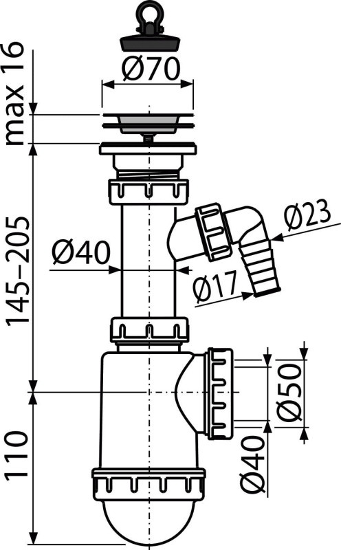 Aplicabilitate: Pentru chiuvetă Caracteristici / Specificatii Tehnice: Evacuare de Ø50 mm sau 40 mm Cu conector pentru mașină de spălat rufe sau vase Material: polipropilenă Specificatii tehnice: Sifon anti miros 53 mm Debit 44 l/min Rezistența termică 95 ˚C Racord furtun 17 – 23 mm