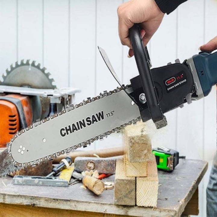 Adaptor tip drujba pentru flex, polizor unghiular 30 cm Lungime lama: 11.5 (30 cm) Pasul lantului: 3/8 Teaca lama Maner Piesa protectie maner Rezervor ulei ungere lant Accesorii montaj Te-ai gandit vreodata ca iti poti transforma propriul flex intr-o minidrujba care sa iti fie utila si practica oriunde si oricand? Ei bine, acum este posibil! Totul dureaza doar 3 minute! Daca nevoia ta de o drujba obisnuita nu e mare, poti sa faci una din polizorul tau unghiular. Adaptorul ocupa foarte putin spatiu, asadar poti avea o scula 2-in-1 chiar in trusa ta de scule. Aceasta este varianta imbuntatita, care are in plus sistemul automat de lubrefiere si prindere mult mai solida. Flexul nu este inclus! Se primeste doar adaptorul cap de mini drujba! Coletul contine doar adaptorul de mini drujba cu accesorii. Kit complet gata de a fi montat pe flex (nu include polizorul unghiular). Pentru polizor unghiular mic, cu filetul de prindere a discului - 10 mm.