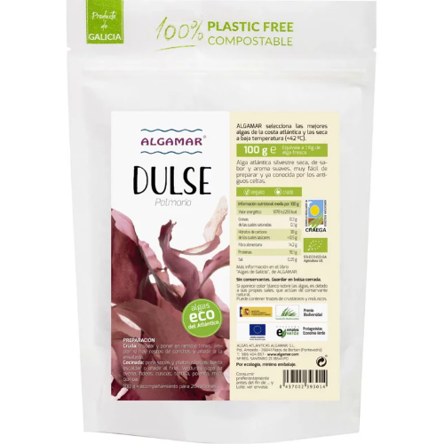 Algele marine marca Algamar sunt toate alge sălbatice, recoltate de pe coastele nepoluate ale regiunii Galicia din Spania. Există și alge marine de cultură, însă nu pot fi comparate calitativ și nutritional cu cele sălbatice. Un alt mare avantaj al algelor sălbatice este că sunt departe de sursele de radiații. Japonia este printre cei mai mari furnizori de alge marine din lume (în special sushi și nori), însă mulți iubitori de alge marine au început să caute alte surse de alge în afară de Japonia, din cauza radiațiilor rezultate în urmă exploziei nucleare de la Fukushima.Este bogată Vitamina C, fosfor și proteine. Ideală în salate și snacks-uri, chiar și fără înmuiere prealabilă!Mod de preparare:- crude: adăugați în salate, se poate adăuga și fără înmuiere, dacă totuși doriți să o inmuiati în prealabil, 2 minute sunt suficiente.- gătite: în supe sau mâncăruri rapide, doar clătiți-le cu apă și adăugați-le la final. Se poate adăuga în orez, mei, quinoa, amaranth, paște, cus-cus, etc.Valori nutriționale/100g:Proteine 18%Grăsimi 2%Carbohidrați 56%Fibre 2.5%Potasiu 7310mgCalciu 560mgMagneziu 610mgFosfor 235mgFier 50mgIod 55mgVitamina A 1.59mgVitamina B12 0.9mgVitamina C 34.5mg.