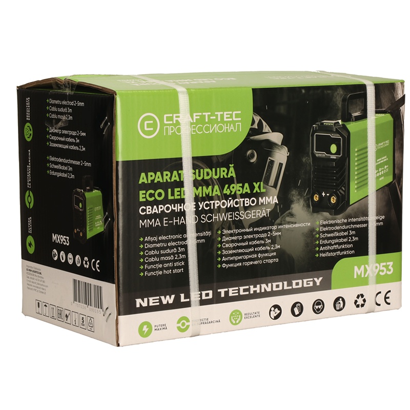Aparat de sudura invertor 495A, cablu sudura 3m, functie anti-stick, protectie la suprasarcina, Accesorii incluse, afisaj digital, IP21S, 1.6-5mm, Craft-Tec MX953 Aparatul de sudura Craft-Tec ECO LED MMA 495A XL este o solutie profesionala si versatila, proiectata pentru sudura de inalta precizie in aplicatii diverse, de la lucrari industriale pana la proiecte DIY. Cu un curent maxim de 495A si tehnologie avansata tip invertor, acest model asigura performante remarcabile, un arc electric stabil si cusaturi curate, indiferent de complexitatea proiectului. Dotat cu afisaj digital LED , control intuitiv si functie anti-stick , aparatul previne lipirea electrodului, facilitand lucrul in siguranta si cu un consum redus de energie. Sistemul integrat de protectie la suprasarcina si supraincalzire contribuie la extinderea duratei de viata a echipamentului, oferind utilizatorului un plus de siguranta in regim intens de functionare. Compatibil cu electrozi de 1.6 – 5 mm , acest aparat poate fi utilizat atat in ateliere mecanice, cat si in santiere, ferme, garaje sau gospodarii. Designul compact si portabil , impreuna cu accesoriile incluse , face ca Craft-Tec MX953 sa fie alegerea ideala pentru cei care cauta un echipament puternic, fiabil si usor de utilizat. Utilizari: Sudura in ateliere de reparatii auto si industriale Fabricarea si montajul structurilor metalice (porti, garduri, rame) Lucrari de intretinere si mentenanta in industrie Proiecte casnice si hobby-uri avansate in atelierul personal Interventii rapide pe santiere sau in zone cu acces limitat Caracteristici tehnice: Tip aparat: Invertor sudura MMA Curent sudura: 30A – 495A Tensiune alimentare: 220–230V / 50Hz Eficienta: 80% Factor de putere: 93% Ciclu de functionare: 60% Diametru electrozi: 1.6 – 5 mm Afisaj: Digital LED Clasa protectie: IP21S Clasa izolatie: F Dimensiuni: 330 x 160 x 240 mm Greutate: 4.75 kg Accesorii incluse: 1 x Aparat de sudura invertor Craft-Tec ECO LED MMA 495A XL 1 x Masca simpla de sudura 1 x Cleste suport electrod (3 m x 12 mm) 1 x Cleste de masa (2.3 m x 12 mm) 1 x Perie cu ciocanel pentru zgura 1 x Manual utilizare in limba romana Craft-Tec MX953 este partenerul ideal pentru sudori profesionisti sau pasionati de proiecte metalice, oferind putere, precizie si fiabilitate intr-un format compact si accesibil.