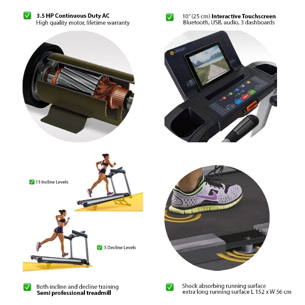 Banda de alergare TR6000iT de la LifeSpan Fitness este o banda de alergat robusta pentru utilizare semiprofesionala, destinata atat salilor de fitness cu trafic redus cat si antrenamentului acasa. Banda de alergare solida pentru uz semiprofesional Aceasta banda de alergare pentru uz semiprofesional este un adevarat must have. Este foarte robusta si potrivita pentru utilizare comerciala in studiouri de personal training, cabinete de fizioterapie, centre de reabilitare, antrenament personal si antrenament intensiv de cardio-rezistenta acasa. Suporta o greutate de pana la 159 kg si are un motor puternic de curent alternativ de 3,5 CP. Consola intuitiva cu ecran tactil interactiv, color, de 10 (25 cm) TR6000iT are o consola intuitiva cu ecran tactil cu IntelliKey. Datorita butoanelor care se aprind unul cate unul, IntelliKey face operarea consolei foarte usoara. Acest lucru va permite sa navigati rapid si usor prin cele 46 de programe de antrenament distractive si diversificate. Puteti vizualiza statistici despre antrenament in mai multe moduri si ferestre. Datorita tehnologiei Quick Draw puteti crea un model pentru cursul nivelului de viteza si inclinatie si puteti efectua un antrenament pe intervale cu alternanta intre viteza mare si mica si inclinatie mare si mica. Consola este, de asemenea, echipata cu un suport media pentru tablete si smartphone-uri si un port USB pentru a salva rezultatele antrenamentului si a incarca dispozitivele mobile. Programe de antrenament variate si provocatoare Programele de antrenament sunt foarte potrivite pentru antrenamentul de fitness, pierderea in greutate si mentinerea unei stari de sanatate generale bune. Cu TR6000iT te vei distra din primul si pana in ultimul minut. Banda de alergare are 17 programe de antrenament Healthy Living, doua programe de antrenament controlate de ritmul cardiac, 21 de programe de antrenament sportiv, 16 programe de slabire, programe de curse 5k/10k, un test de fitness Rockport, o plimbare de 1 mila dezvoltata de fiziologi pentru a va determina nivelul de antrenament si testul de fitness al Marinei. In plus, puteti alege oricand sa va configurati propriul program de antrenament si sa il salvati. Puteti utiliza unul dintre cele doua programe de utilizare manuala pentru a face acest lucru. Interfata Bluetooth, suport tableta si difuzoare Bluetooth TR6000iT are o interfata Bluetooth, astfel incat sa puteti asocia banda de alergare cu tableta. Puteti folosi o tableta pentru a naviga pe internet sau pentru a viziona filmul sau serialul preferat punand tableta in suportul pentru tableta. Datorita difuzoarelor integrate puteti asculta muzica preferata de pe telefon sau tableta. Cotierele extra largi fac ca TR6000iT sa fie perfecta pentru utilizare in fizioterapie si reabilitare Banda de alergare TR6000iT este echipata cu cotiere extra largi pentru a va sprijini optim in timpul antrenamentului. Daca aveti dificultati in mentinerea echilibrului, cotierele ofera solutia perfecta. De asemenea, ofera siguranta suplimentara la pornirea si oprirea benzii de alergare. Datorita cotierelor extra largi, banda de alergare este foarte potrivita pentru utilizare in fizioterapie si reabilitare. Ai parte de un antrenament confortabil si sigur Suprafata de alergare masoara 152 cm lungime si 56 cm latime si este potrivita pentru toate tipurile de antrenament de la mers incet la alergat intens. Cele 8 amortizare va protejeaza impotriva socurilor si va permit sa va antrenati pe termen lung fara grija unor posibile dureri articulare, ale spatelui sau genunghilor. TR6000iT este o banda de alergare pentru uz semiprofesional si perfect capabila sa reziste la antrenamente lungi si intense. Specificatii consola: Zona de afisare: consola cu ecran tactil de 10” (25 cm) usor de navigat Informatii afisate: timp, calorii arse si calorii arse pe ora, distanta, numar pasi si pasi totali pe minut, ritm cardiac si ritm cardiac maxim procentual, viteza, nivel de inclinare, ritm, ture totale si timp partial, inclinatie Afisare grafica: da Programe de exercitii: 2 programe de ritm cardiac, 2 programe personalizabile de utilizator, 17 programe prestabilite (5 programe de gestionare a greutatii, 5 programe „Viata sanatoasa”, 7 antrenamente sportive), incalzire si racire, Rockport Fitness Test si Navy Fitness Test, 2 programe personalizabile Control cu butonul QuickSet: 5 butoane de viteza / 5 butoane de inclinare Compatibilitate cu tableta: da Suport media: da Port USB: da Pedometrul Intelli Step: da Controlul ritmului cardiac: 2 senzori de ritm cardiac la cotiere si conexiune Bluetooth pentru a utiliza o curea pentru piept optionala pentru a va masura ritmul cardiac Specificatii tehnice: Motor: 3,5 CP pentru functionare continua AC Rotatii pe minut (RPM): 3400 de rotatii pe minut Gama de viteze: 0,8 - 21 kmp/h Inclinatie: -3 - 13% Inclinare automata: da Suspensii de punte: 8 amortizoare de compresie independente Rola: 64 mm fata, 51 mm spate Sine laterale: din aluminiu Siguranta Intelli Guard: da Tehnologia de desenare rapida: da Suport de sticle: da Dimensiuni: L 189 x l 89 x H 141 cm Pliabil: nu Clasificare: semi-profesional Greutatea produsului: 110 kg Greutatea maxima a utilizatorului: 159 kg Compatibil cu IHP: da Transport: 2 roti montate in fata si 2 roti montate in spate Audio: da Tip curea: 3 straturi, 2,4 mm Punte: 1,6 cm Dimensiuni de livrare: L 200 x l 94 x H 41 cm, 122 kg Certificat: CE Cod EAN: 8719532056455 * Functia Intelli-Step monitorizeaza numarul de pasi parcursi in timpul antrenamentului, fiind perfect pentru a masura ritmul cu care va indepliniti obiectivele zilnice de miscare.** In cazul in care trebuie sa intrerupeti antrenamentul, Intelli-Guard este o functie de siguranta ce intervine automat si opreste banda dupa 20 de secunde de functionare fara utilizator, pentru a elimina riscul accidentarii altor persoane.*** Intelli-Key este un sistem de ghidare a operatiunilor consolei, prin intermediul unor lumini inteligente de pe butoane, care se ap