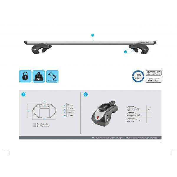 Bare transversale aluminiu Menabo Dozer XXL compatibile cu Fiat Doblo ll Maxi 2015+ Setul de bare transversale cuprinde toate elementele necesare pentru montarea pe barele longitudinale ale autoturismului. Cu o lungime de 150cm si capacitate de 90 kg, barele se potrivesc pentru toate tipurile de portbagaje (cutii portbagaj, suport bicicleta, suport schi, portbagaj caiac/canoe, etc.). Barele transversale sunt prevazute cu canal standard profil T de 20mm pentru montarea diferitelor accesorii, oferindu-va astfel o gama larga de posibilitati pentru transportul bagajelor. Barele transversale beneficiaza de un sistem de prindere fix si sigur ce previne miscarea sau jocul acestora si implicit al bagajelor in trafic. Sistemul este dotat cu sistem antifurt. Barele au sectiune ovala ce confera un profilul aerodinamic barelor transversale ce ajuta la minimalizarea zgomotului si reducerea rezistentei aerodinamice. Sistemul de bare portbagaj contine: - 2 x Bare transversale din aluminiu - 4 x Sisteme de prindere pe barele longitudinale - 1 x Cheie imbus (nu este necesara o alta unealta) Specificatii tehnice: - Lungime bara: 1500 mm - Inaltime bara: 27 mm - Latime bara: 54 mm - Greutate: 3.4 kg - Material: aluminiu - Canal pe toata lungimea barei de 20mm - Sistem antifurt: Da - Capacitate maxima de incarcare: 90 kg - Testate TUV si ISO/PAS 11154:2006 (clauses 5.2.5, 5.3.5) - In conformitate cu DIN 75302 Video prezentare generala Menabo Dozer Filmuletele si pozele sunt cu titlu de prezentare. Pentru in montaj corect si rapid, folositi manualul de instructiuni inclus in pachet. Greutatea maxima de incarcare poate sa fie diferita in functie de marca si modelul masinii. Consultati caracteristicile tehnice date de producatorul autoturismului.