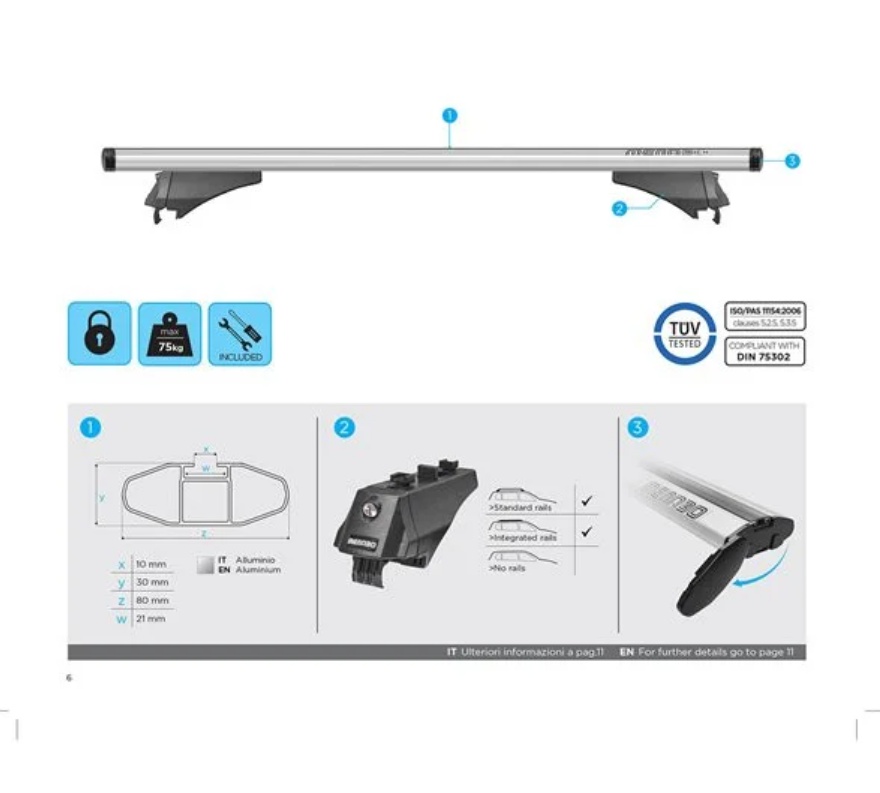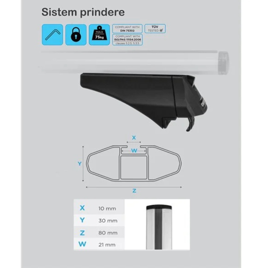 Bare transversale portbagaj Menabo Leopard Silver compatibile cu Kia Sportage (QL) 2016+ Bare transversale din aluminiu Menabo Leopard Silver va ofera o flexibilitate sporita in transportarea bagajelor datorita capacitatii de incarcare de 75 kg, dar si a canalului standard pentru prindere cu profil T a diferitelor accesorii. Barele au sectiune aerodinamica de 8 cmsi se potrivesc pentru toate tipurile de portbagaje (cutii portbagaj, suport bicicleta, suport schi, portbagaj caiac/canoe, etc.). Profilul aerodinamic in forma de aripa al barelor transversale ajuta la minimalizarea zgomotului si reduce rezistenta aerodinamica. Setul de bare transversale cuprinde toate elementele necesare pentru montarea pe barele longitudinale de tip sina (integrate) ale autoturismului. Sistemul de bare portbagaj cuprinde: - 2 x Bare transversale din aluminiu - 4 x Sisteme de prindere pe barele longitudinale - 4 x Sisteme antifurt + Chei - 1 x Cheie imbus (nu este necesara o alta unealta) Specificatii tehnice: - Lungime bara: 1200 mm - Inaltime bara: 30 mm - Latime bara: 80 mm - Greutate sistem: 4.8 kg - Material: aluminiu - Canal 20 mm pentru prindere T pe toata lungimea barei - Sistem antifurt: Da - Capacitate maxima incarcare: 75 kg - Aprobate TUV & ISO/PAS 11154:2006 Video montaj Menabo Leopard Filmuletele si pozele sunt cu titlu de prezentare. Pentru in montaj corect si rapid, folositi manualul de instructiuni inclus in pachet. Greutatea maxima de incarcare poate sa fie diferita in functie de marca si modelul masinii. Consultati caracteristicile tehnice date de producatorul autoturismului.