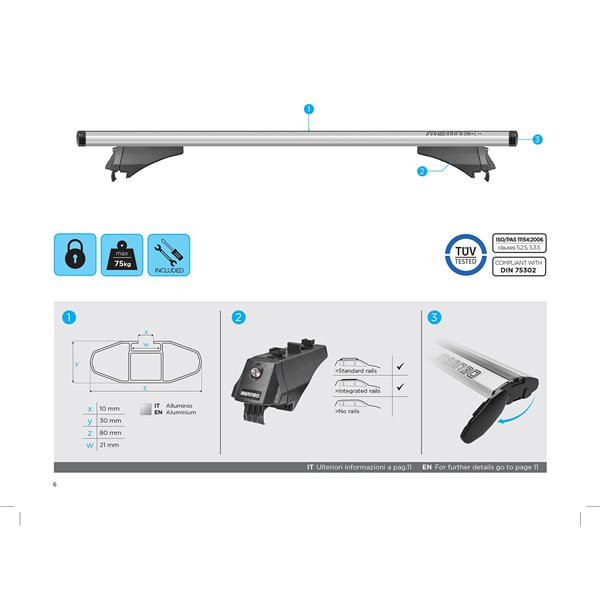 Bare transversale portbagaj Menabo Leopard Silver compatibile cu Mercedes E Station Wagon (S213) 2016+ Bare transversale din aluminiu Menabo Leopard Silver va ofera o flexibilitate sporita in transportarea bagajelor datorita capacitatii de incarcare de 75 kg, dar si a canalului standard pentru prindere cu profil T a diferitelor accesorii. Barele au sectiune aerodinamica de 8 cmsi se potrivesc pentru toate tipurile de portbagaje (cutii portbagaj, suport bicicleta, suport schi, portbagaj caiac/canoe, etc.). Profilul aerodinamic in forma de aripa al barelor transversale ajuta la minimalizarea zgomotului si reduce rezistenta aerodinamica. Setul de bare transversale cuprinde toate elementele necesare pentru montarea pe barele longitudinale de tip sina (integrate) ale autoturismului. Sistemul de bare portbagaj cuprinde: - 2 x Bare transversale din aluminiu - 4 x Sisteme de prindere pe barele longitudinale - 4 x Sisteme antifurt + Chei - 1 x Cheie imbus (nu este necesara o alta unealta) Specificatii tehnice: - Lungime bara: 1200 mm - Inaltime bara: 30 mm - Latime bara: 80 mm - Greutate sistem: 4.8 kg - Material: aluminiu - Canal 20 mm pentru prindere T pe toata lungimea barei - Sistem antifurt: Da - Capacitate maxima incarcare: 75 kg - Aprobate TUV & ISO/PAS 11154:2006 Video montaj Menabo Leopard Filmuletele si pozele sunt cu titlu de prezentare. Pentru in montaj corect si rapid, folositi manualul de instructiuni inclus in pachet. Greutatea maxima de incarcare poate sa fie diferita in functie de marca si modelul masinii. Consultati caracteristicile tehnice date de producatorul autoturismului.