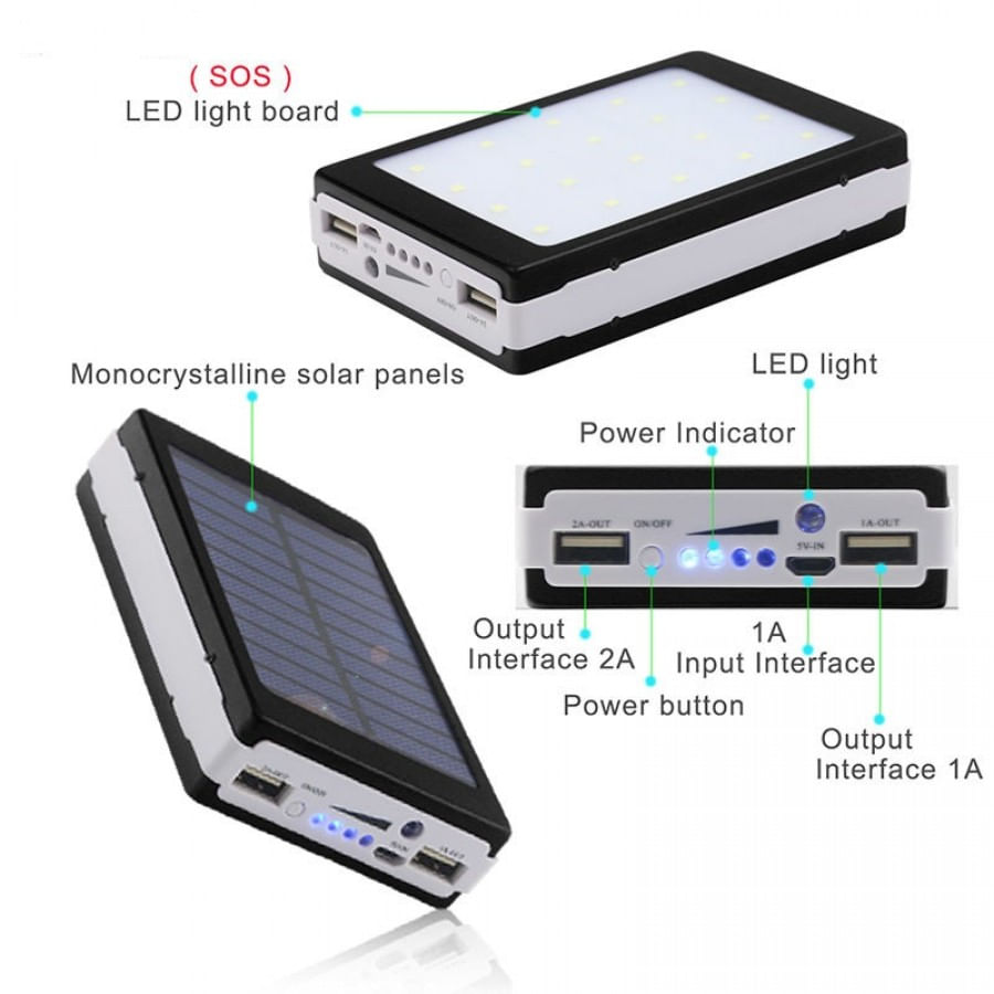 Descriere:/nBaterie externa este compatibila cu toate telefoanele mobile, tablete, smartphones, e-book reader, iPad, GPS-uri, PSP, camere foto/video si a altor echipamente care se pot alimenta de la USB 5V./nCompatibila cu aproape toate brandurile de telefoane mobile ca de ex: NOKIA, APPLE, SAMSUNG, BLACKBERRY, HTC, LG etc., deoarece puteti folosi cablul USB de incarcare al dispozitivului dumneavoastra./nEste foarte util in situatia cand nu avem acces la o sursa de incarcare conventionala sau cand calatorim in zone fara electricitate, in excursii pe munte etc./nPoate substitui cu succes alimentatorul auto, de asemenea are si lanterna cu LED, incorporata./nBateria Externa are si lanterna cu LED, incorporata. Mini lanterna se aprinde / stinge la apasarea de doua ori consecutiv a butonului Power./nBateria Externa are panou solar pentru incarcare. Cand se pune la lumina zilei primul led indicator baterie se aprinde, insemnand ca bateria se incarca direct de la soare./nAtentie: Bateria trebuie formatata la prima utilizare/n Formatare bateriei: /nPasul 1. Descarcarea comleta a bateriei externe./nPasul 2. Incarcarea comleta a bateriei externe./nSpecificatii:/n Tensiune de intrare: DC 5.0V/n Curent de intrare: 1000mA (Max)/n(Pentru incarcarea bateriei externe trebuie folosit doar cablul din pachet)/n Iesiri USB: 2/n Tensiune de iesire: 5.0V/n Curent de iesire (port 1): 1A MAX /n Curent de iesire (port 2): 2.1A MAX/n (Pentru incarcare folosi cablul USB de incarcare al dispozitivului dumneavoastra)/n Protectie: IC pentru incarcare / scurtcircuit / descarcare/n Capacitate Baterie: 20000 mah 3.7V/n Capacitate Baterie dupa conversie la 5V: 7000 mah 5V /n Indicator LED incarcare: DA (Culoare albastru)/n Butoane disponibile: Power/n Incarcari: Pana la 700 de ori/n Dimensiuni: 124 mm x 78 mm/n Grosime: 25 mm/n Material: PC, ABS/n Lanterna 1: 1 Led Albastru/n Lanterna 2: 20 Led Alb rece/n Culoare: Gri / Negru / Albastru / Roz / Galben (culoarea poate diferii in functie de stoc)/n Cablu: USB la MicroUSB/n Culoare Cablu: Alb/n Tip baterie: Lithium Ion 18650 x 5/n Panou Solar: 1.5W/n Indicator incarcare solara: Da /n Indicator procentaj baterie: 5 Leduri Albastre./nPachetul Contine:/n1. 1x 20000 mAh Power Bank Solar/n2. 1x Cablu conector incarcare microUSB/n3. 1x Cutie/Ambalaj prezentare