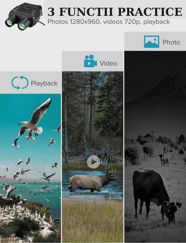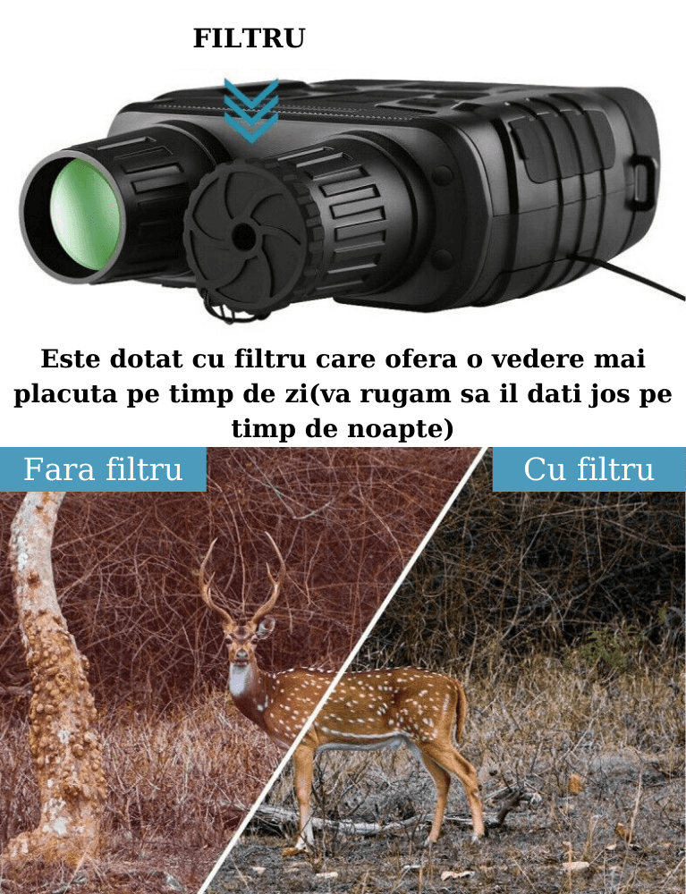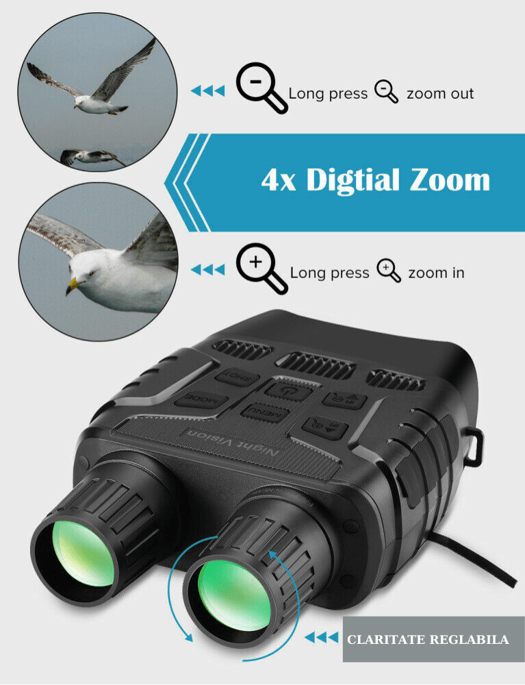 • Vedere clara in intuneric total - In timp ce alte dispozitive tip urmarire cu vedere de noapte nu pot oferi fotografii si filme de calitate ridicata fara a fi ajutate de lumini ambientale, sau fara a consuma rapid acumulatorii atasati, fiind lipsite de posibilitatea de a focaliza subiectul, acest binoclu cu vedere nocturna prin infrarosu foloseste un echipament de iluminare care nu emite raze luminoase, astfel ca puteti sa observati timp de cateva ore, diferite animale noaptea, in intuneric total, fara a folosi lumini suplimentare. Focalizarea se realizeaza usor, oferindu-va astfel posibilitatea sa realizati fotografii clare. Noi pretuim prioritatile dumneavoastra. •Nu lasati intunericul sa va strice aventura nocturna - daca va place sa observati animalele salbatice in intuneric, sa vanati coioti,mistreti sa va supravegheati vitele sau sa verificati daca pe proprietatea dumneavoastra sunt intrusi, folositi binoclul nostru dotat cu cea mai eficienta tehnologie digitala cu vedere de noapte. Imaginati-va ca puteti sa faceti fotografii sau filme cu o claritate ridicata, pe intuneric total, avand posibilitatea de a salva fotografiile sau filmele pe un card de memorie pentru ca apoi sa le impartasiti cu prietenii... Nu a fost niciodata mai usor. •Ne mandrim cu faptul ca noi cream doar lentile premium folosite pentru vanatoare, pescuit, securitate in cadrul fermelor sau pentru distractii in natura. •Binoclul nostru va ofera vedere nocturna chiar si in timpul celor mai intense activitati.Carcasa exterioara este foarte solida protejand camera interioara.Zoom: 4xTip: vedere nocturna cu infrarosuDiametrul lentilelor in obiectiv: 40mm Campul vizual al camerei: 200-300 mGreutate: 576gFunctioneaza cu 6 baterii AA care sunt incluse in pachet!*Acest produs include taxa de timbru verde in valoare de:0.75