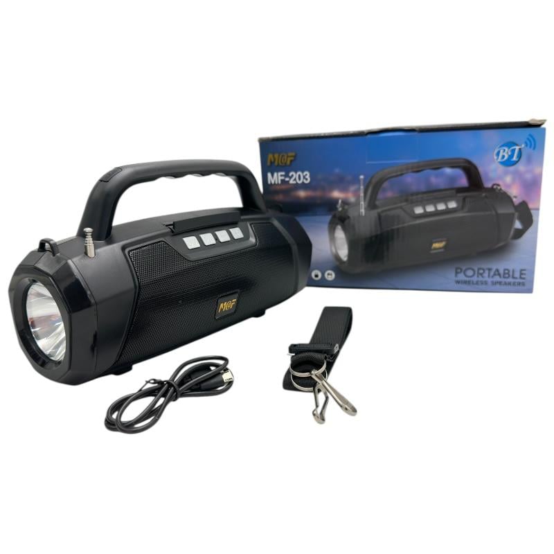 Boxa portabila MF-203 LED este alegerea ideala pentru iubitorii de muzica si mobilitate. Cu doua difuzoare puternice de 4,5W si un sunet clar si echilibrat, ofera o experienta audio de calitate, oriunde te-ai afla. Carcasa rezistenta, grila metalica frontala si finisajul modern o transforma intr-un gadget practic si estetic. Conectivitatea Bluetooth 4.1 permite asocierea rapida cu telefoane sau tablete, iar profilurile suportate HFP / HS / A2DP / AVPCP asigura compatibilitate extinsa. Cu o baterie de 1200 mAh reincarcabila, boxa ofera pana la 2 ore de redare, iar incarcarea se face rapid prin portul LED micro-USB. Dispune de multiple functii utile: slot pentru card TF, port USB, intrare AUX si radio FM integrat, astfel incat poti asculta muzica preferata in orice moment. Accesoriile incluse (cablu de incarcare si cablu AUX) iti ofera tot ce ai nevoie pentru utilizare imediata.Putere nominală de ieșire: 2 x 5WDifuzoare: 2 difuzoare de 4,5W, diametru 52 mmBaterie: 1200 mAh, 3.7VVersiune wireless (Bluetooth): 4.1Profiluri Bluetooth acceptate: HFP / HS / A2DP / AVPCPTensiune de intrare: DC 5V, 800 mARăspuns în frecvență: 20 Hz – 20 kHzRaport semnal-zgomot: 75 dB – 95 dBDistorsiune: 1%Timp de redare: Aproximativ 2 oreTimp de Incărcare: Aproximativ 2.5 oreFuncții: Bluetooth wireless, radio FM, slot pentru card TF (microSD), port AUXInterfață de încărcare: LED micro-USBAccesorii incluse: Cablu de încărcare USB, cablu AUX