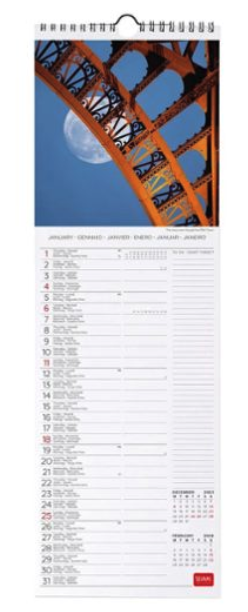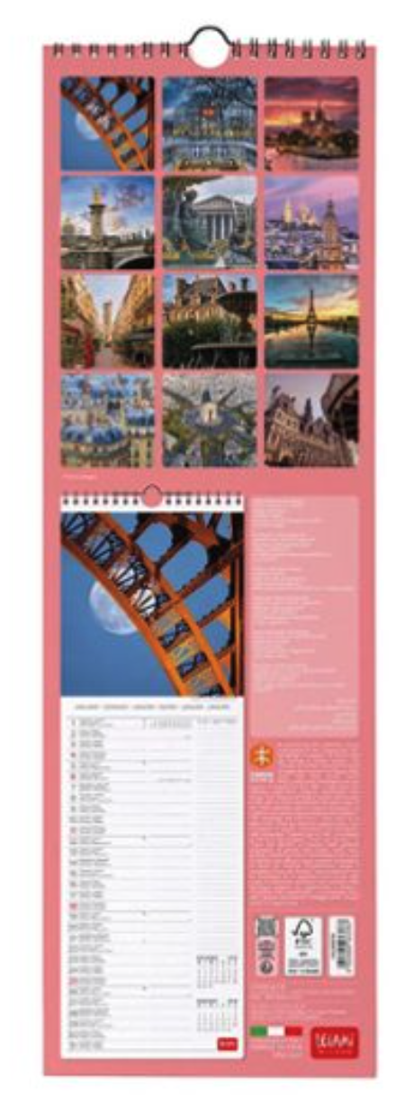 Calendar 2026 - Paris2026 photo wall calendar (16 x 49 cm) with an assortment of photos, one for each month, Paris design. Contains 12 photos plus a 2026 annual planner, spaces for zodiac signs and international holidays. Each page displays the previous and subsequent months. Note the week number. This product is made with raw materials from sustainably managed forests, FSC-certified paper, and manufactured in Europe.