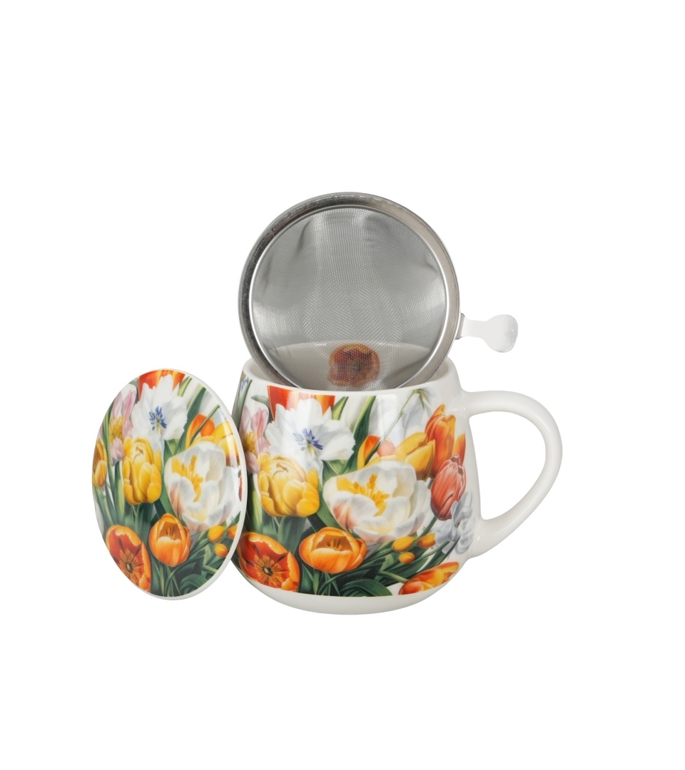 Aceasta cana cu infuzor de 430 ml este potrivita pentru cei care prefera sa prepare ceaiul direct in cana, intr-un format practic si usor de folosit. Are corp rotunjit, maner confortabil si un volum potrivit pentru o portie generoasa, ceea ce o face utila atat acasa, cat si la birou. Setul include cana, infuzorul metalic si capacul. Infuzorul permite prepararea ceaiului vrac direct in cana, iar capacul ajuta la pastrarea caldurii in timpul infuzarii. Dupa ce ceaiul este gata, infuzorul poate fi scos usor, iar cana ramane potrivita pentru servire directa. Pentru cautari online, produsul se incadreaza natural in expresii precum cana cu infuzor, cana cu capac, cana pentru ceai vrac sau cana portelan cu infuzor. Decorul este inspirat de Starry Night, una dintre imaginile cel mai usor de recunoscut asociate lui Vincent van Gogh. Pe suprafata canii apar cerul intens albastru, miscarea circulara a norilor si stelele luminoase, completate de accente galbene si verzi specifice compozitiei. Modelul continua si pe capac, iar in interior se vede un mic detaliu decorativ care pastreaza coerenta vizuala a setului. Rezultatul este o cana care iese imediat in evidenta prin imagine, fara sa piarda din caracterul practic. Este o cana potrivita pentru cei care cauta un obiect util, dar si bine rezolvat vizual. Starry Night combina functia practica a unei cani cu infuzor cu un decor artistic clar, usor de integrat in rutina zilnica daca preferi piese cu personalitate vizuala puternica.
