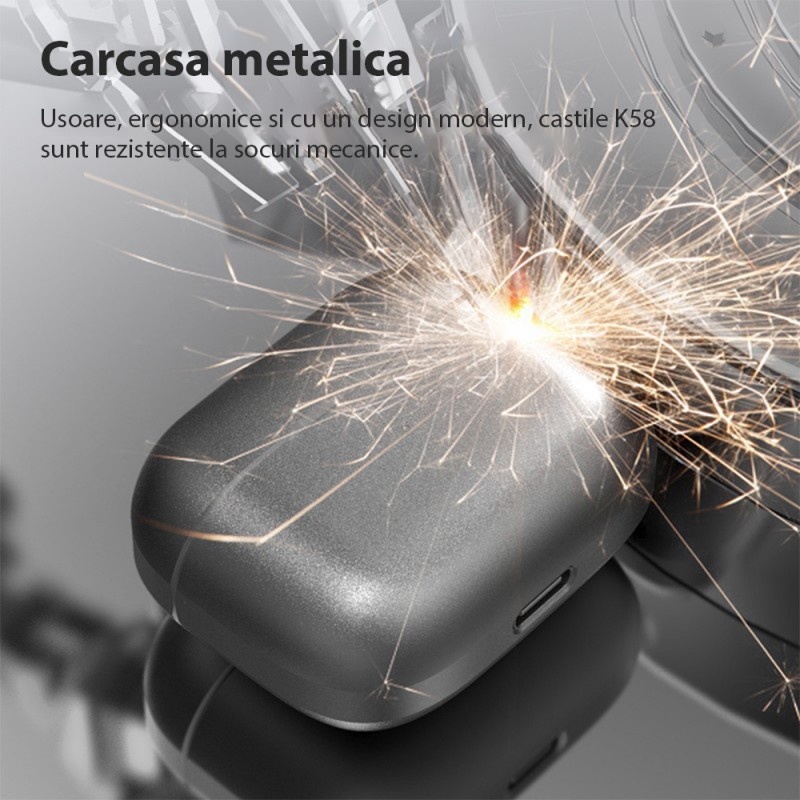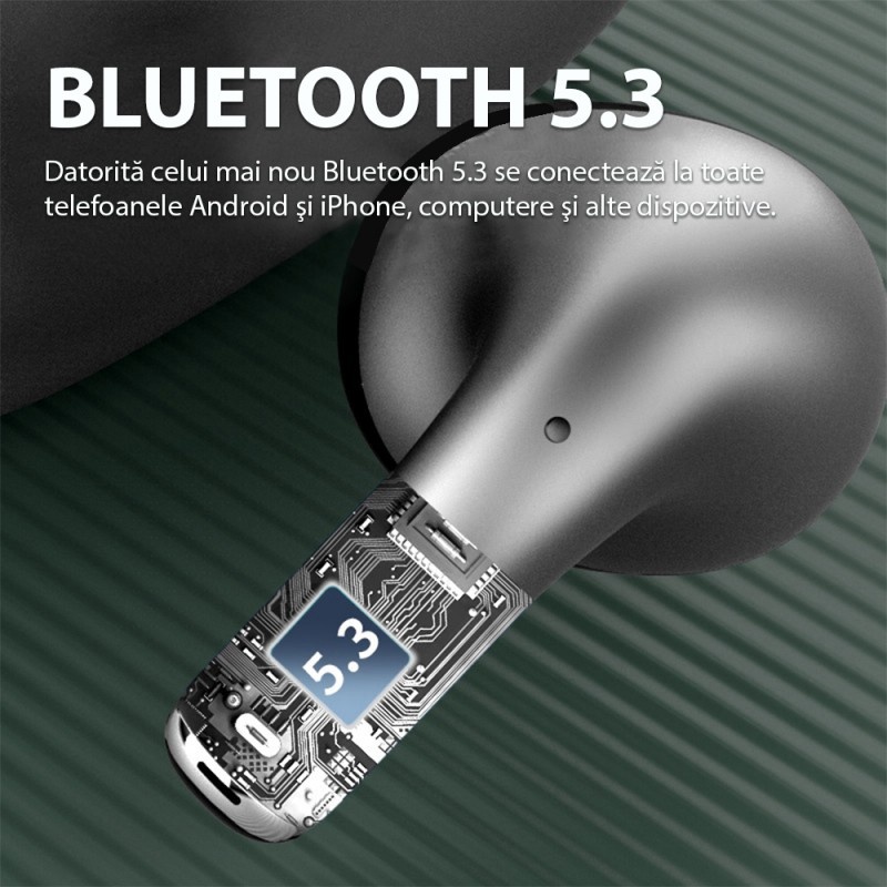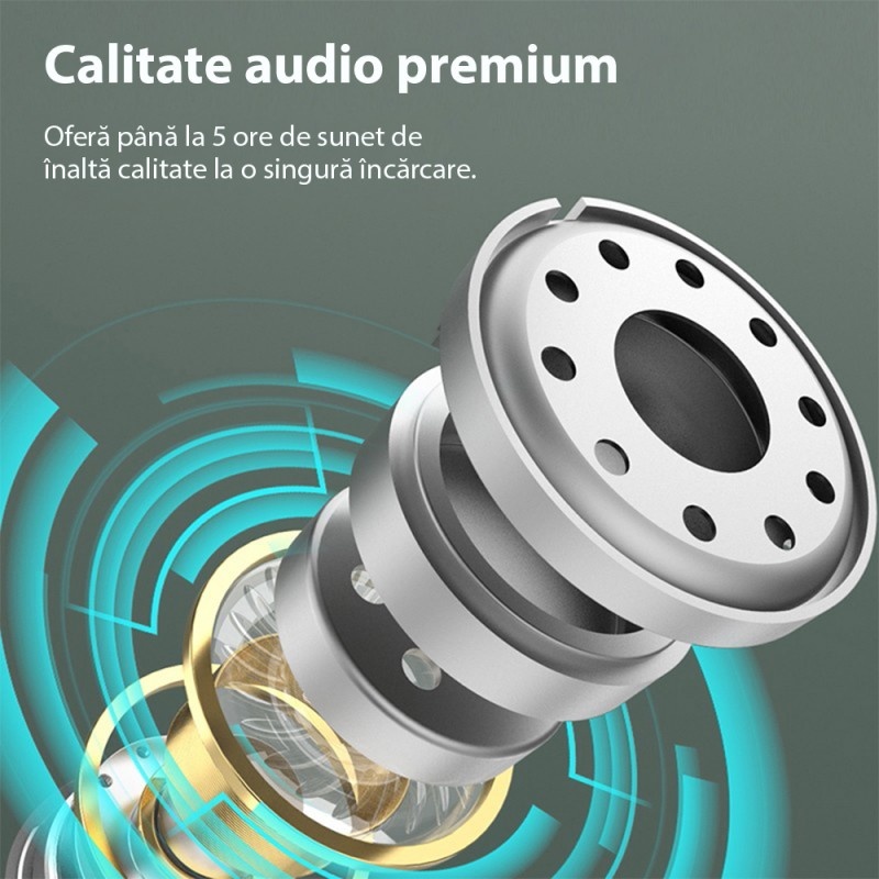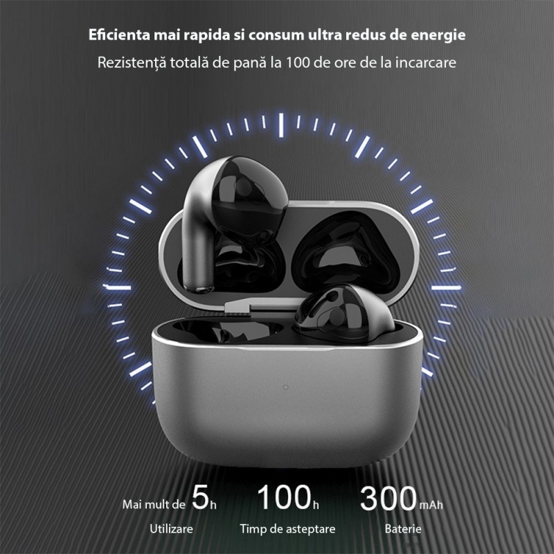 Castile Bluetooth Sport Techstar® K58 au mod de estompare activ a zgomotului ambiental (ANC) şi un mod de pătrundere care, dimpotrivă, amplifică sunetele din jur chiar şi la volum crescut. Datorită celui mai nou Bluetooth 5.3 se conectează la toate telefoanele Android şi iPhone, computere şi alte dispozitive. Control tactil și control al volumului: Împreună cu senzori tactili inteligenți, căști fără fir Gebuds poate obține controlul suprem (controlul volumului disponibil) fără a utiliza telefonul și poate preveni în mare măsură disconfortul, cum ar fi butonul fizic (90% din căștile wireless: controlul volumului indisponibil). Cu un design ergonomic și reproiectat, căștile wireless Gebuds se pot potrivi și rămâne securizate în canalul urechii chiar și cu mișcări intense. Sun Like a Pro: O calitate audio premium este esențială pentru a obține performanțe mai mari. Instalate cu tehnologia apt-X, căștile wireless Gebuds oferă transmisie puternică, cu rată scăzută de biți și scalabilitate pentru sunet fără pierderi gratuit. Nimic mai important pentru a avea întotdeauna muzică cu tine în timpul celui mai dificil antrenament. Durată mare de viață a bateriei: Numai căștile wireless oferă până la 5 ore de sunet de înaltă calitate la o singură încărcare, iar carcasa de încărcare inclusă oferă 4 încărcări suplimentare, oferind 25 de ore de redare totală. Împerecherea într-un singur pas și rezistența la apă IPX5: Pur și simplu scoateți căștile wireless din carcasa de încărcare și se vor conecta automat la telefon (după ce au fost împerecheate prima dată). Rezistența la apă IPX5 le face ideale pentru antrenamente și alergări intense. Compatibilitate universală: Căști wireless Gebuds Compatibile cu majoritatea playerelor de muzică fără fir, inclusiv iPhone, Samsung, Huawei, smartphone-uri Android, PC și Mac. Specificatii: Versiunea Bluetooth: 5.3 Dimensiune difuzor: unitate bobină mobilă de 10 mm Raspuns in frecventa: 20Hz~20kHz Sensibilitate: 105 dB Impedanță: 32 ohmi Sensibilitate MIC: -38dB Tip baterie pentru căști: baterie litiu-ion polimer (35mAh 3.7V) Timp de încărcare a căștilor: în 1,5 ore Tipul bateriei din compartimentul de încărcare: baterie litiu-ion polimer (300mAh 3.7V) Timp de încărcare al compartimentului de încărcare: în 1,5 ore Timp de redare a muzicii: 5h Timp de așteptare: 100 h Aspect material: aliaj de zinc Funcția comutator Hall: deschideți capacul și conectați. Pachetul include: 2 x căști Bluetooth 1 x cutie pentru căști 1 x cablu de încărcare.