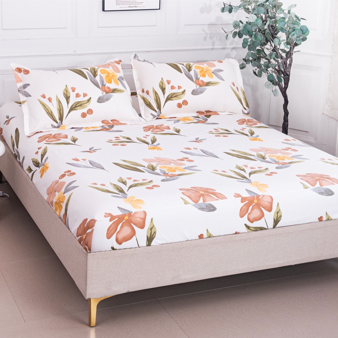 Cearsaf cu Elastic 180x200 cm + 2 Fete de Perna 50x70 cm, Ivoire, Flori de Toamna