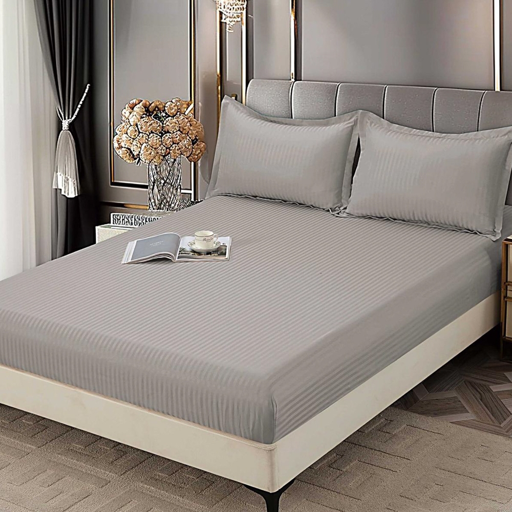 Cearsaf cu Elastic 180x200 cm Damasc Finetat, 70% Bumbac, si 2 Fete de Perna 50x70 cm, Gri deschis