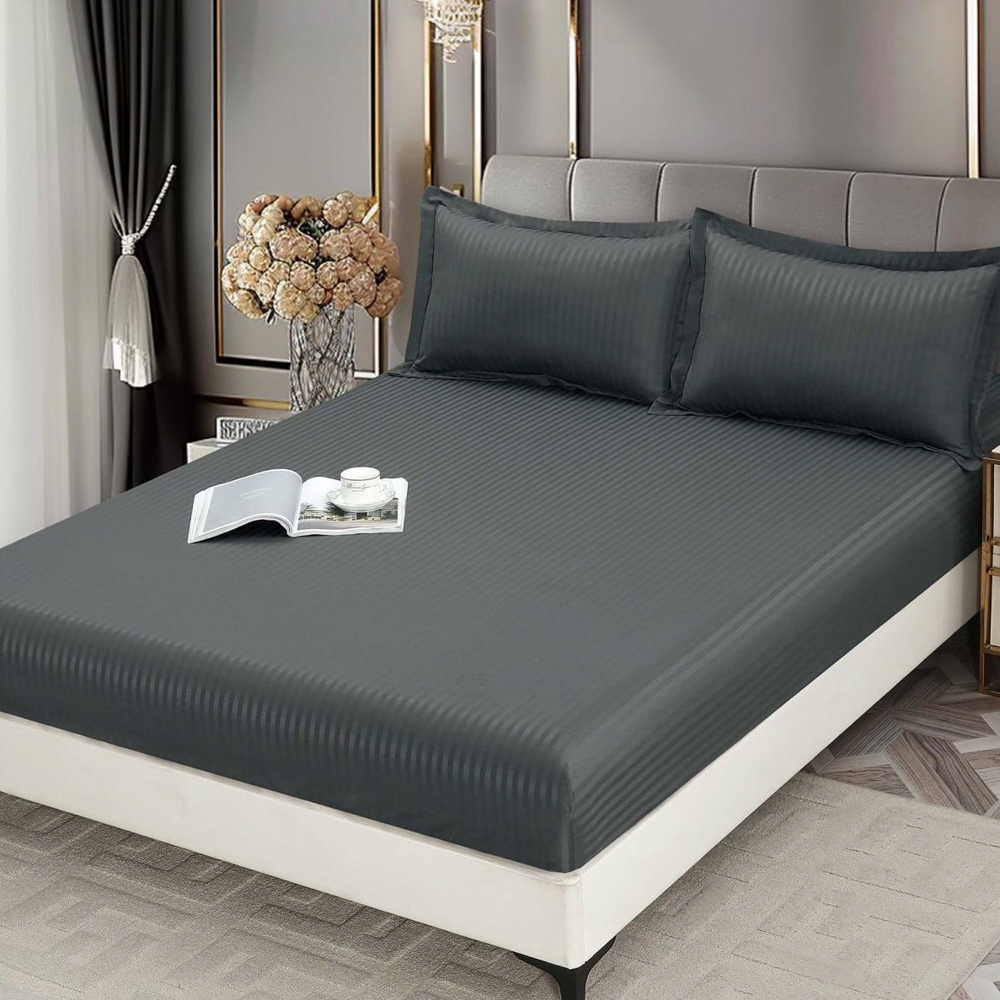 Cearsaf cu Elastic 180x200 cm Damasc Finetat, 70% Bumbac, si 2 Fete de Perna 50x70 cm, Gri inchis