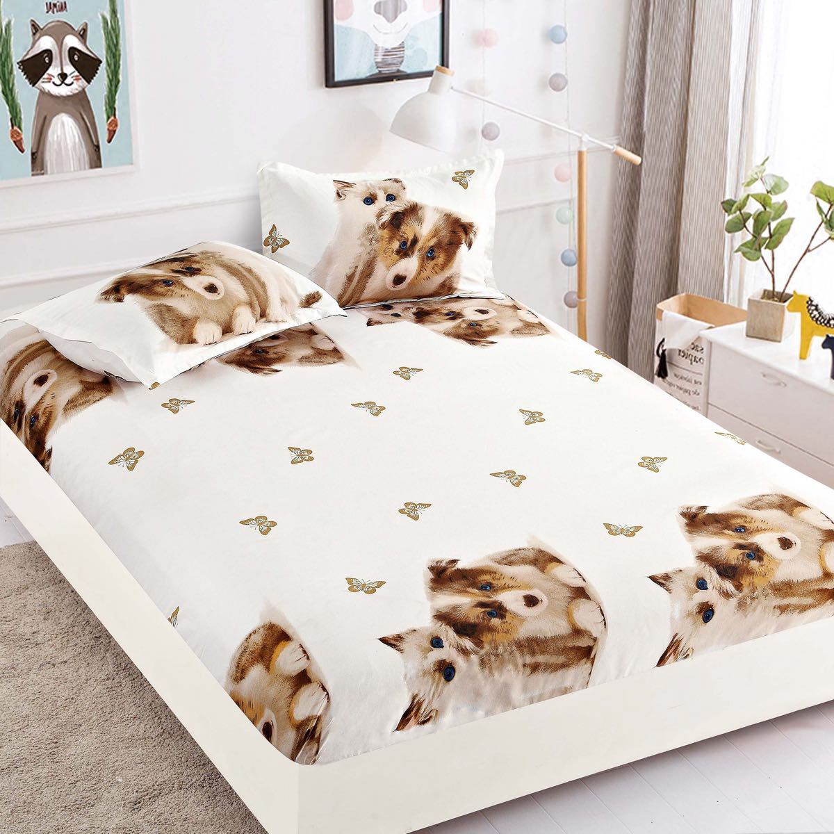 Cearsaf cu elastic, Bumbac FINET, 160/180x200cm, 2 fete de perne 50x70cm, Jojo Home, Crem-Maro, pisicute, catelusi si fluturi