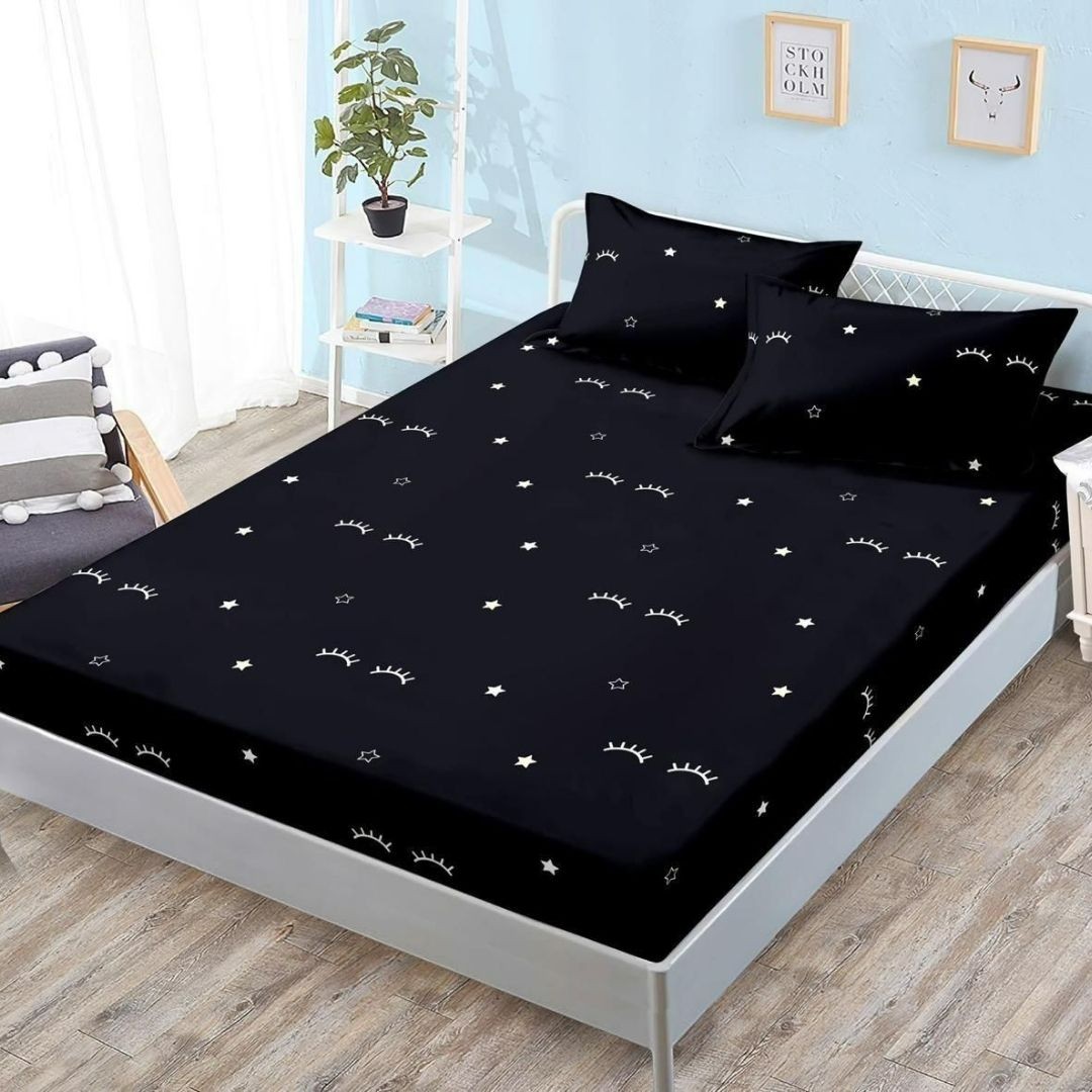 Cearsaf cu Elastic, Bumbac Satinat, 180x200 cm + 2 Fete de Perna 50x70 cm, Negru, Gene