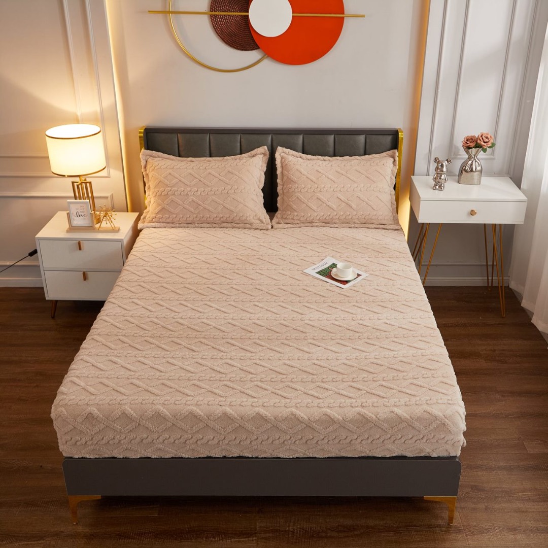 Cearsaf cu Elastic Cocolino, Model 3D Tricotat, 180x200x25 cm – Set cu 2 Fete de Perna, Gros si Pufos, Bej