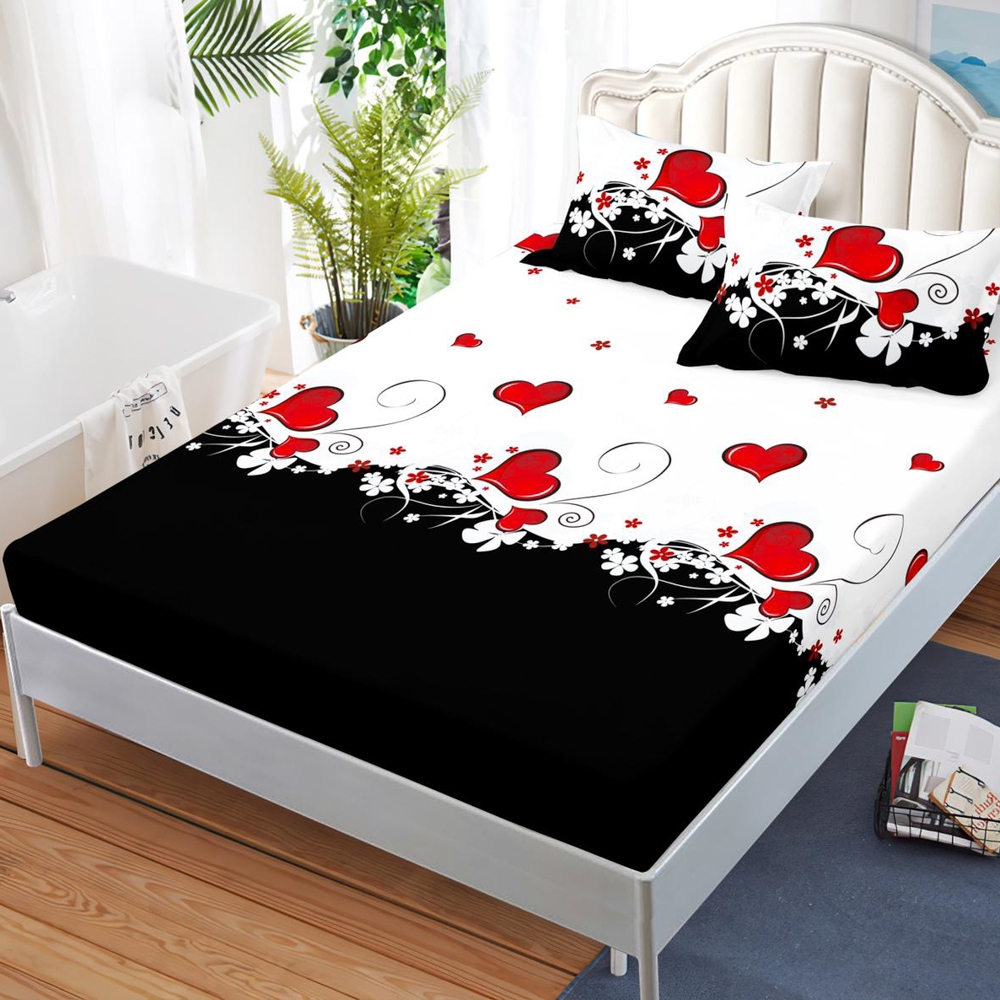 Cearsaf cu elastic, FINET, 180x200cm, 2 fete de perne 50x70cm, Alb, Negru, inimioare