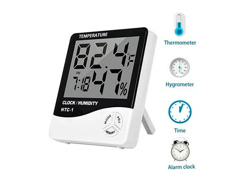 Descriere Caracteristici: *Instalare baterie - scoateti capacul bateriei si instalati bateria. *Tasta de setare a temperaturii in grade Celsius si Fahrenheit este acoperita de suportul din spate, apasati tasta Celsius si Fahrenheit pentru a comuta afisajul in grade Celsius si Fahrenheit. *Setarea orei - apasati MOD timp de 2 secunde, apoi timpul minutelor va clipi. Apasati MOD pentru a comuta ora si timpul minutei. Apasati butonul ADJ pentru a ajusta ora corecta. *Setarea orei in format de 12/24 ore - apasati MOD timp de 2 secunde, apoi apasati MOD de 2 ori pentru a comuta setarea de 12/24 ore, apasati ADJ pentru a ajusta 12/24 ore. *Setarea lunii (L) si a zilei (D) - apasati MOD timp de 2 secunde, apoi timpul minutelor clipeste, apasati MOD de 3 ori pentru setarea lunii si a zilei, apasati ADJ pentru a ajusta data corecta si apasati MOD pentru a comuta setarea lunii (L) si a zilei (D). *Setarea orei actuale - apasati MOD o data pentru a comuta setarea alarmei, apasati ADJ pentru a comuta functia de timp actual. *Setarea ceasului de alarma - apasati MOD o data pentru a comuta setarea alarmei; apasati ADJ de 3 ori pentru a comuta functiile de timp actual si de alarma; apasati MOD timp de 2 secunde pentru setarea orei de alarma; apasati MOD pentru a comuta ora si minutul, apasati ADJ pentru a seta ora. *Sub modul de setare a ceasului de alarma - apasati ADJ pentru a afisa calendarul. *Apasand MEMORY, afisajul va arata temperatura si umiditatea minima si maxima. *Apasati MEMORY timp de 2 secunde pentru a sterge maximul si minimul. Specificatii: Tip: Termometru Material: ABS Iluminare din spate: Nicioa Culoare text: negru Interval de temperatura: -50°C ~ +70°C (-58°F ~ +158°F) Interval de umiditate: 20% ~ 99% RH Precizia temperaturii: ±1°C (1.8°F) Rezolutia temperaturii: 0.1°C (0.1°F) Precizia umiditatii: ±5% RH (40% ~ 80%) Sursa de alimentare: 1 x AAA 1.5V Dimensiuni: 100mm x 93mm x 20mm/3.96 x 3.66 x 0.90 (aproximativ)