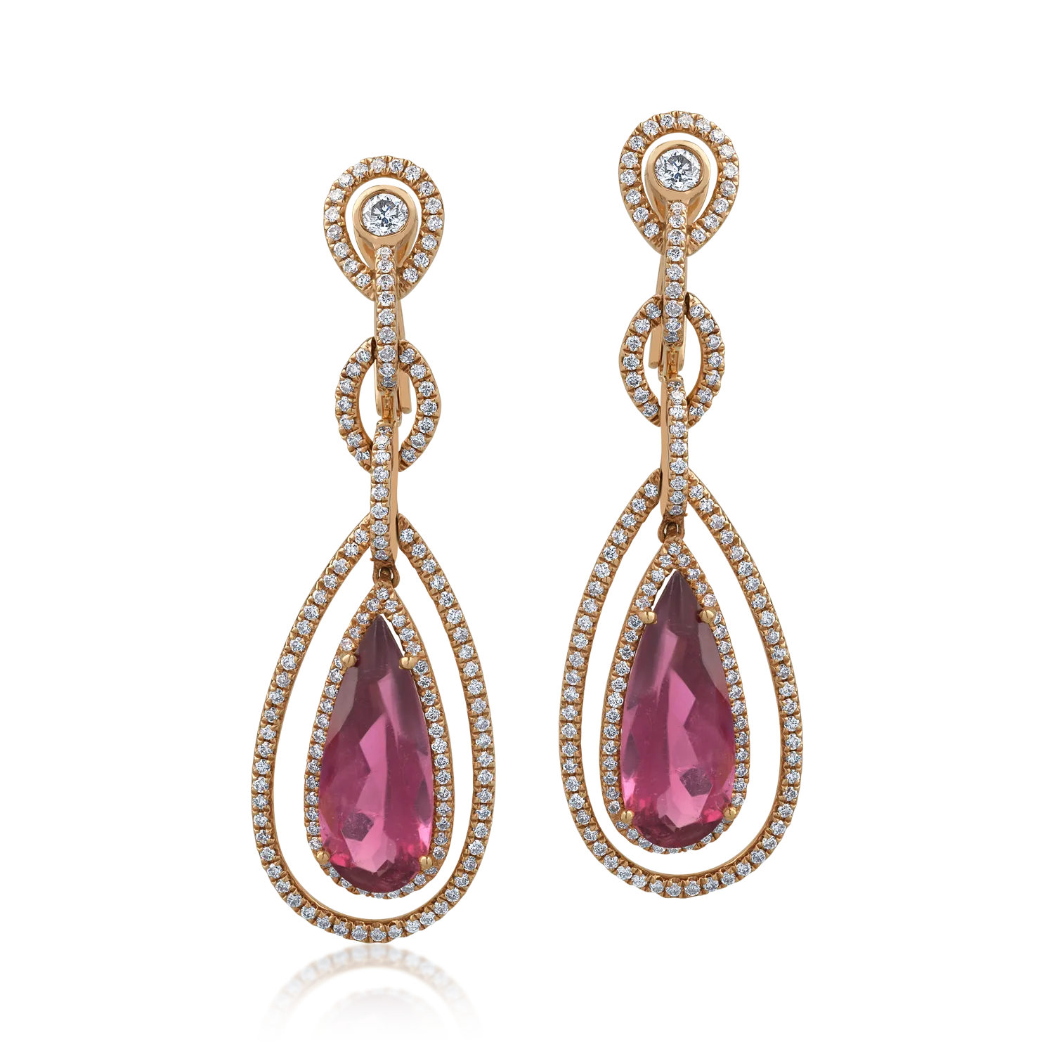 Poarta bijuteriile care iti dau incredere in tine. Perechea de cercei din aur roz cu turmaline roz de 6.7ct si diamante de 1.27ct imbina echilibrat stralucirea cu eleganta intr-un design pretios. Completeaza orice tinuta si vorbeste despre latura ta feminina. in fiecare zi. Cu fiecare pas.