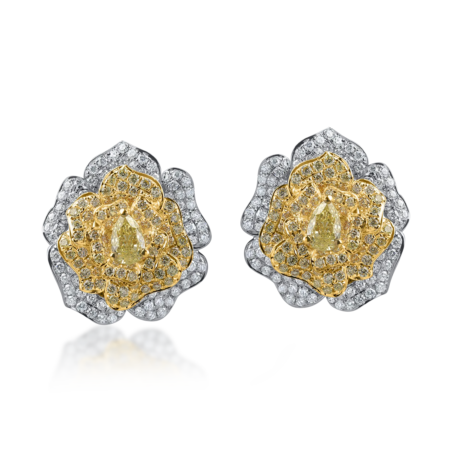 Cerceii floare din aur alb-galben cu diamante galbene si incolore de 2.6ct sunt o declaratie de stil feminin, cu detalii lucrate cu grija. Stralucesc cu eleganta si aduc un vibe fresh unei forme clasice. Lasa-te inspirata de colectiile TEILOR.