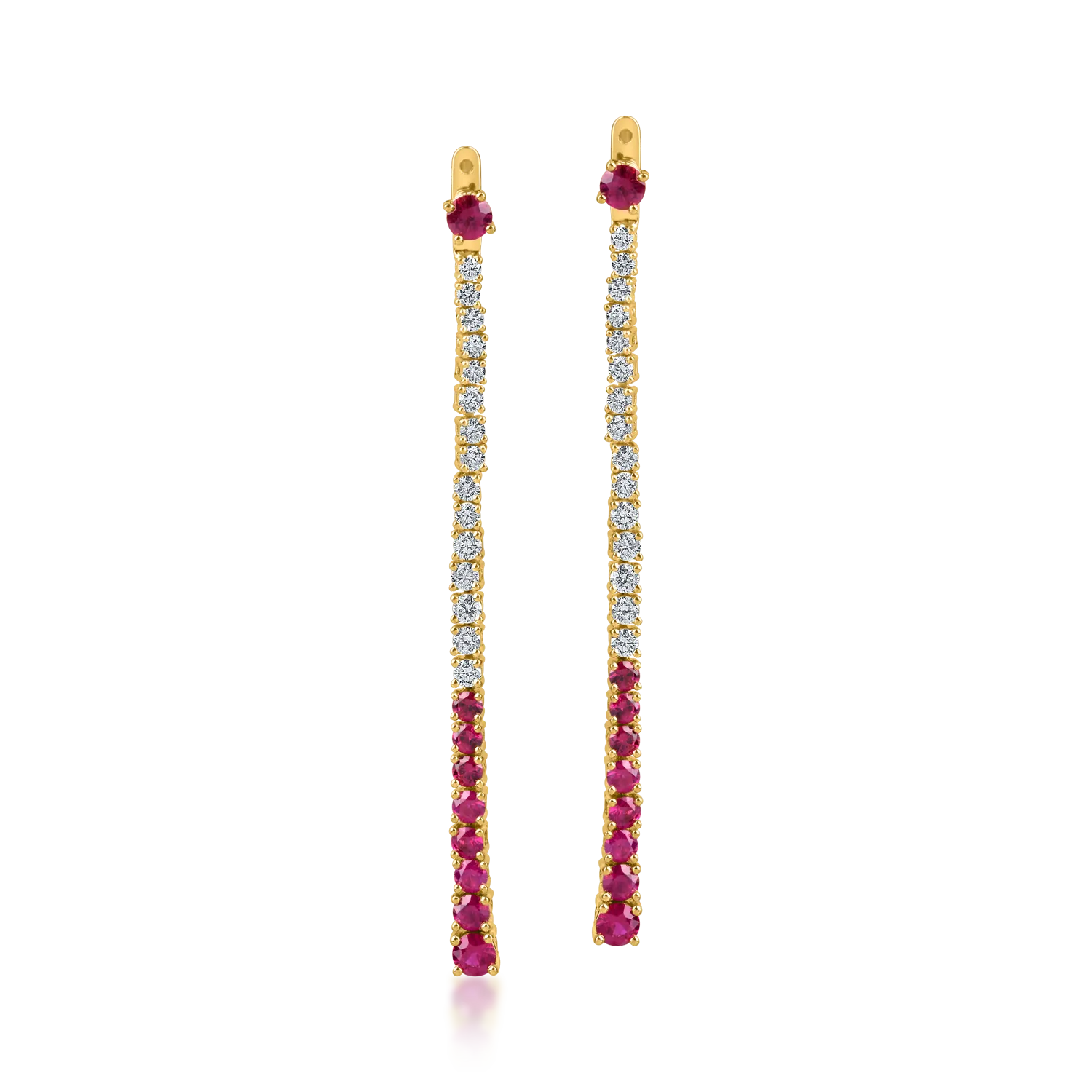 Bijuteriile ideale te conduc intr-o calatorie extraordinara a stilului. Un simbol al femeii contemporane, aceasta pereche de cercei lungi din aur galben cu rubine si diamante 2.2ct se evidentiaza prin durabilitatea metalului, armonios integrat cu montura pietrelor. TEILOR - experiente de neuitat.